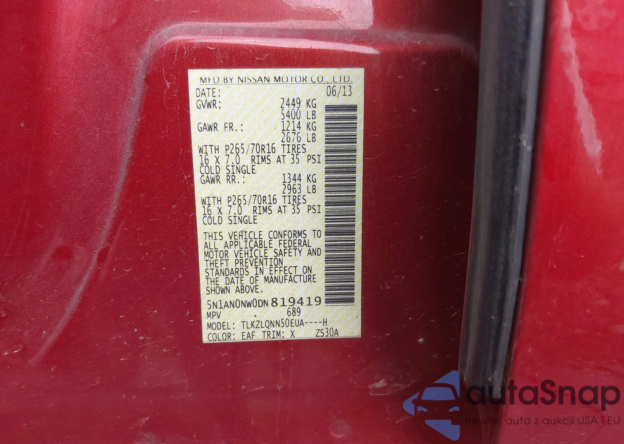 LOT: 43158532 VIN: 5N1AN0NW0DN819419
