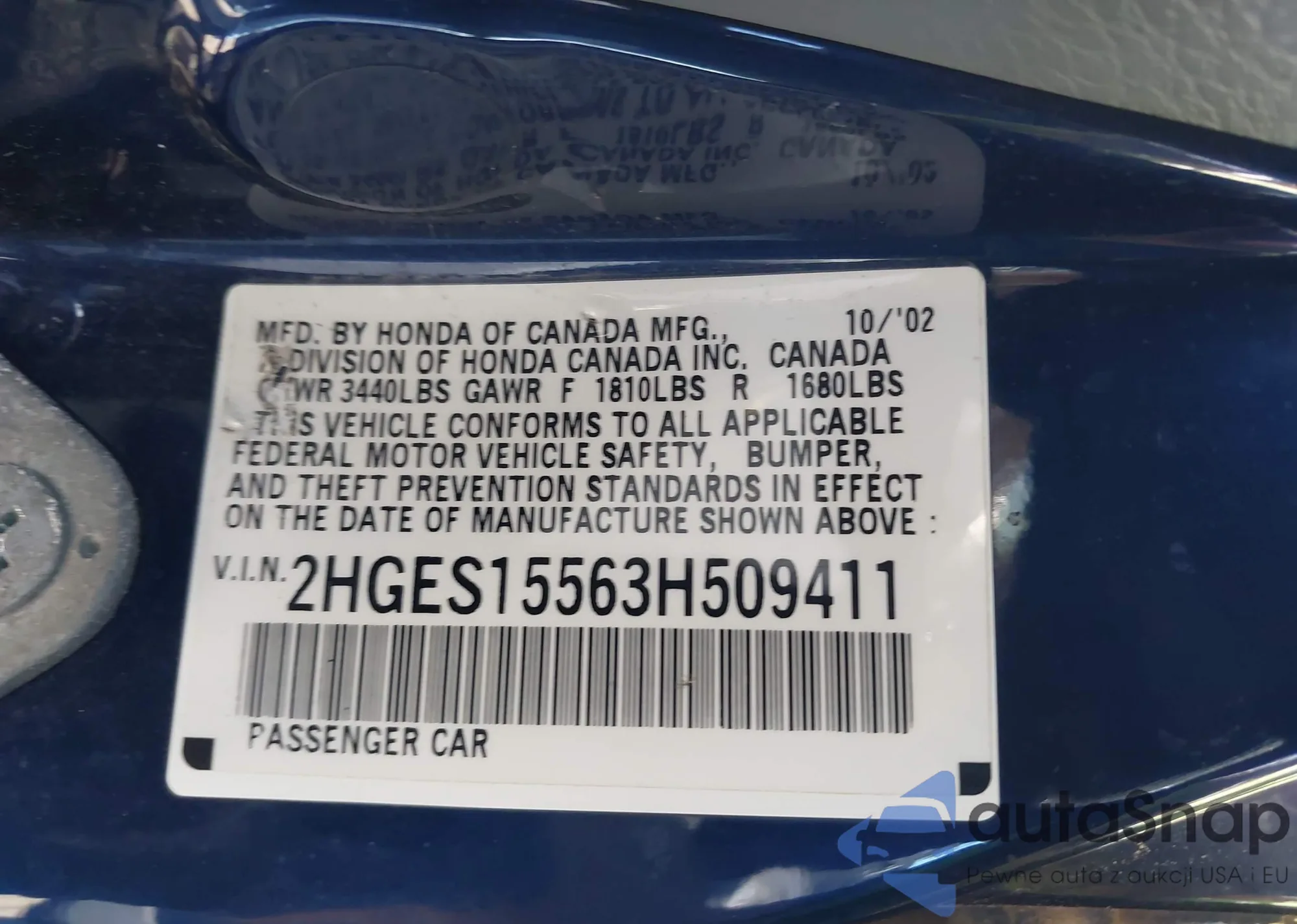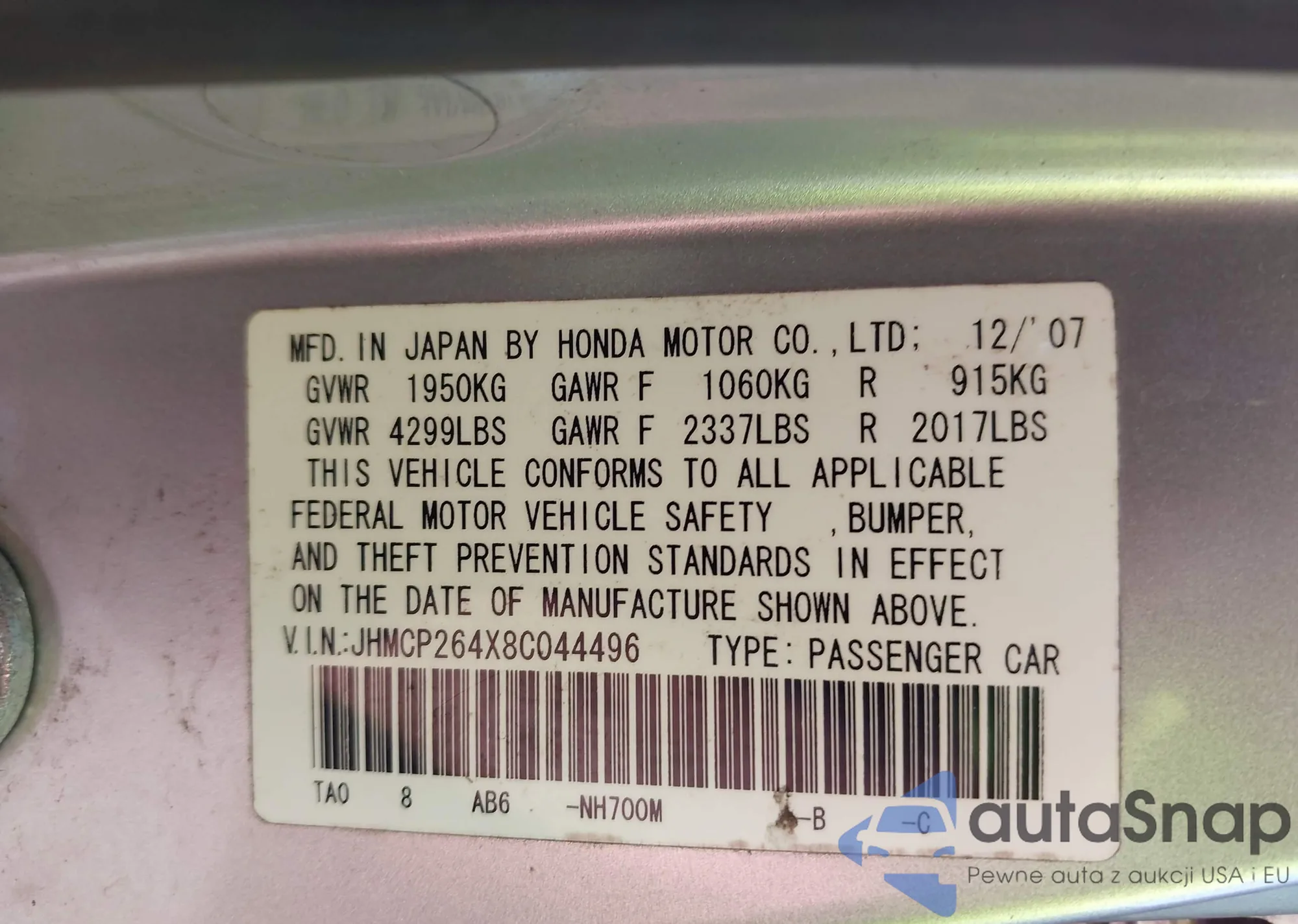 LOT: 43468477 VIN: JHMCP264X8C044496