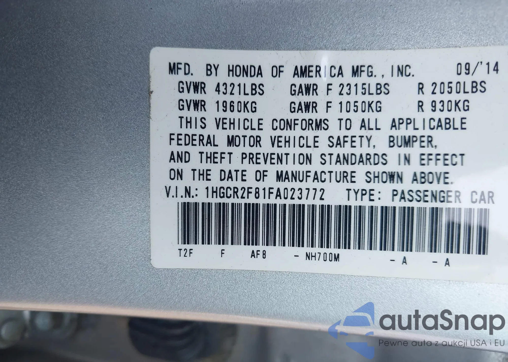 LOT: 43015511 VIN: 1HGCR2F81FA023772