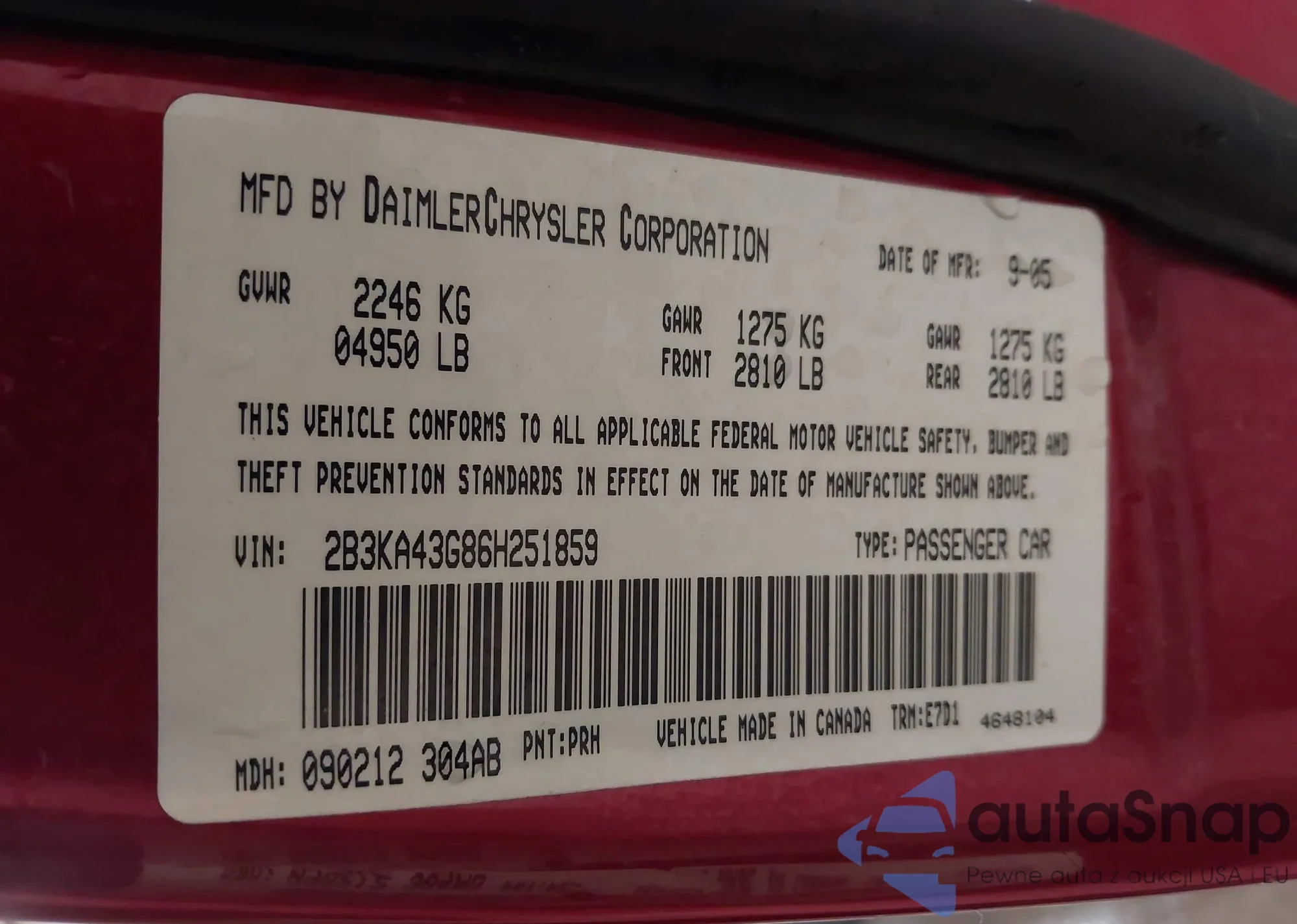 • VIN 2B3KA43G86H251859