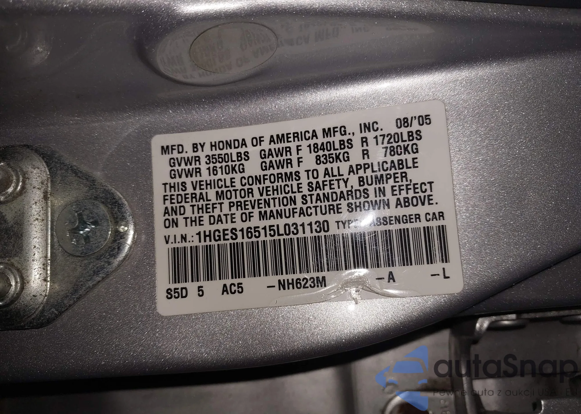 LOT: 43616345 VIN: 1HGES16515L031130