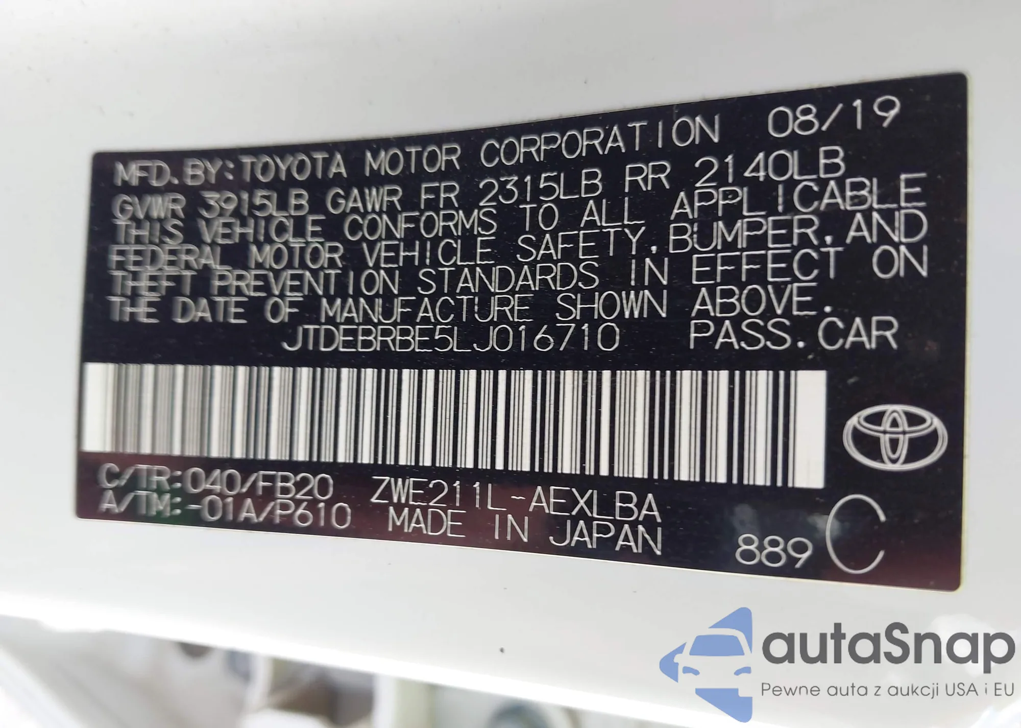 LOT: 43152095 VIN: JTDEBRBE5LJ016710