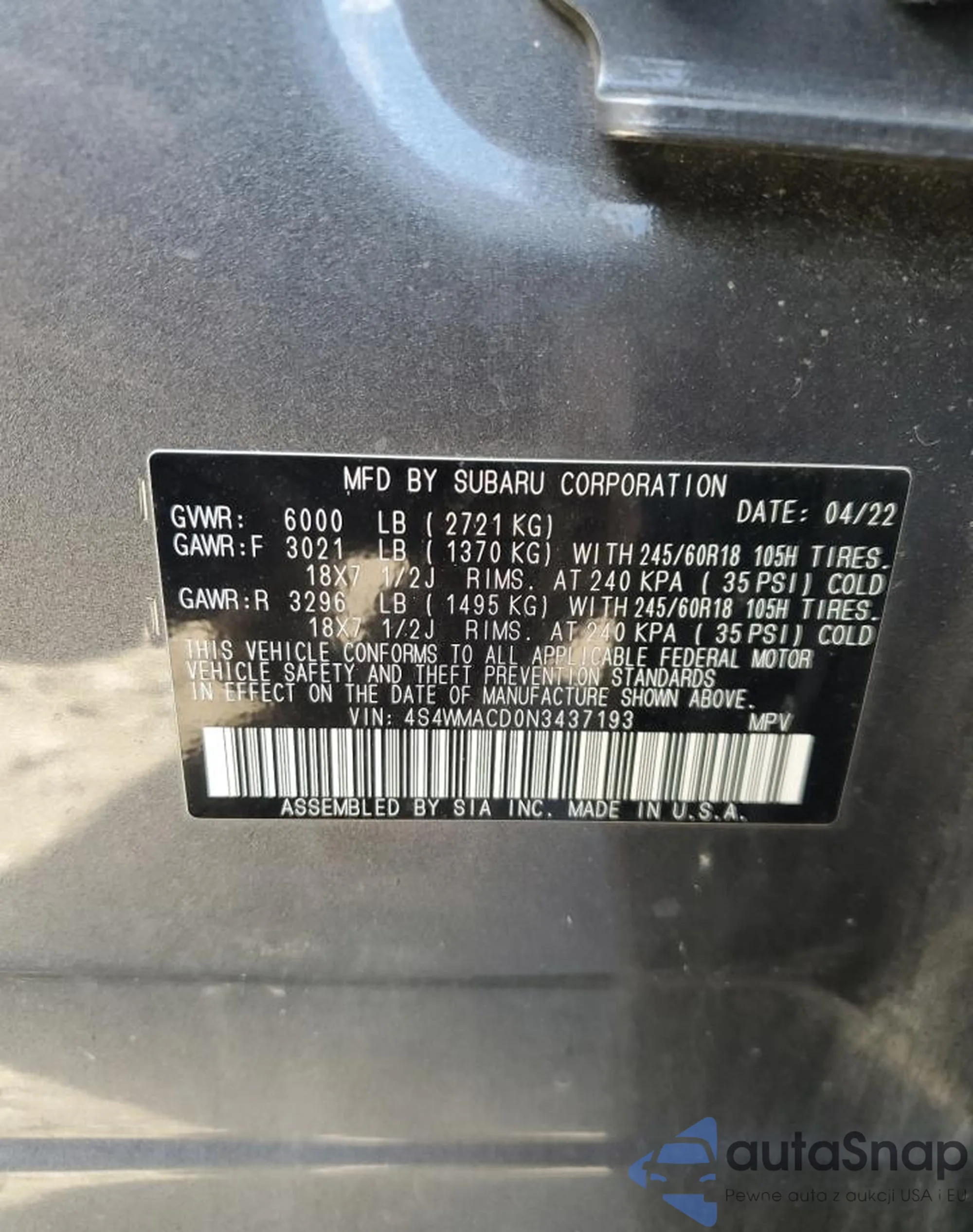 2022 Subaru Ascent Premium z USA, uszkodzony, nr VIN 4S4WMACD0N3437193