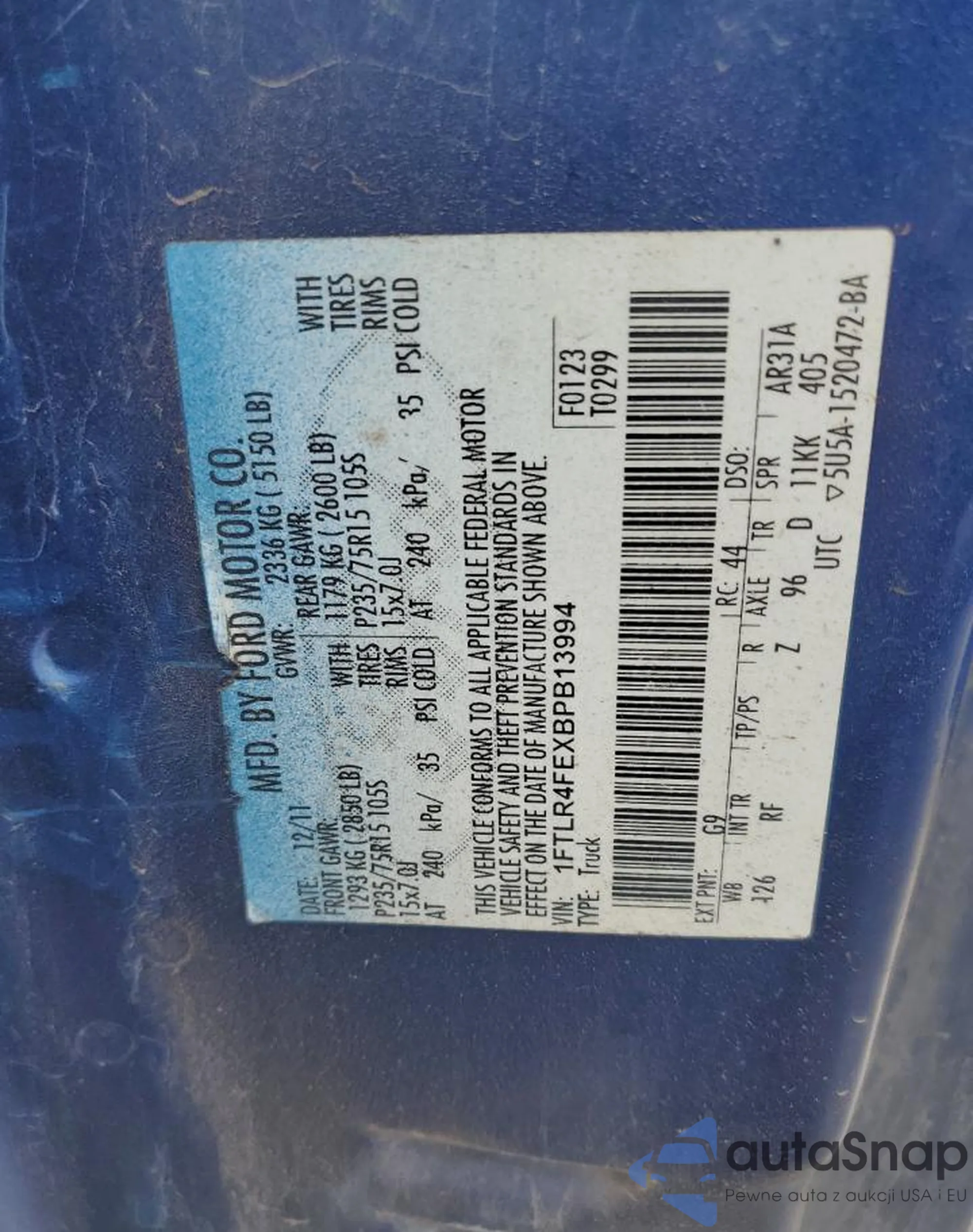 LOT: 81637275 VIN: 1FTLR4FEXBPB13994