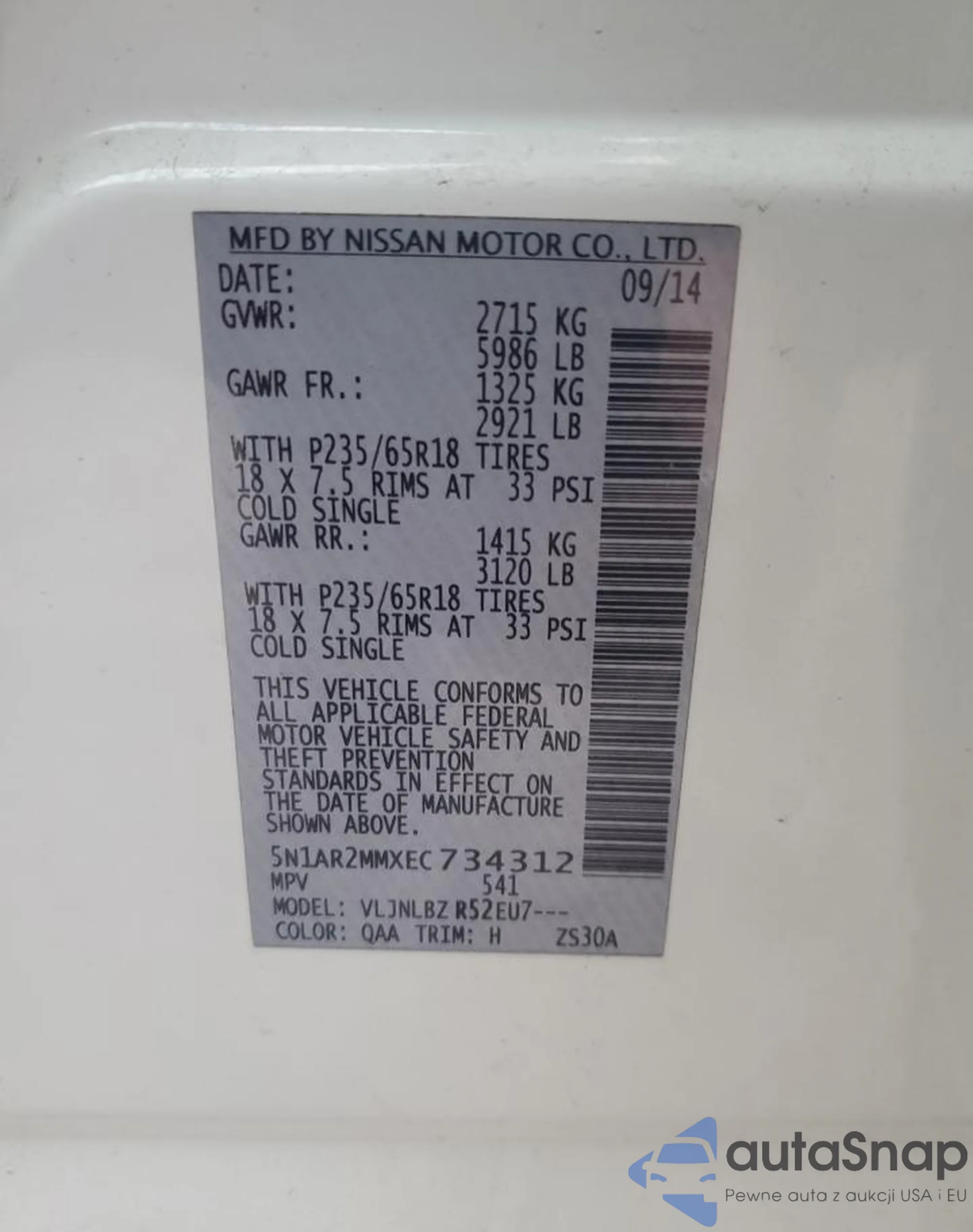 LOT: 91360855 VIN: 5N1AR2MMXEC734312