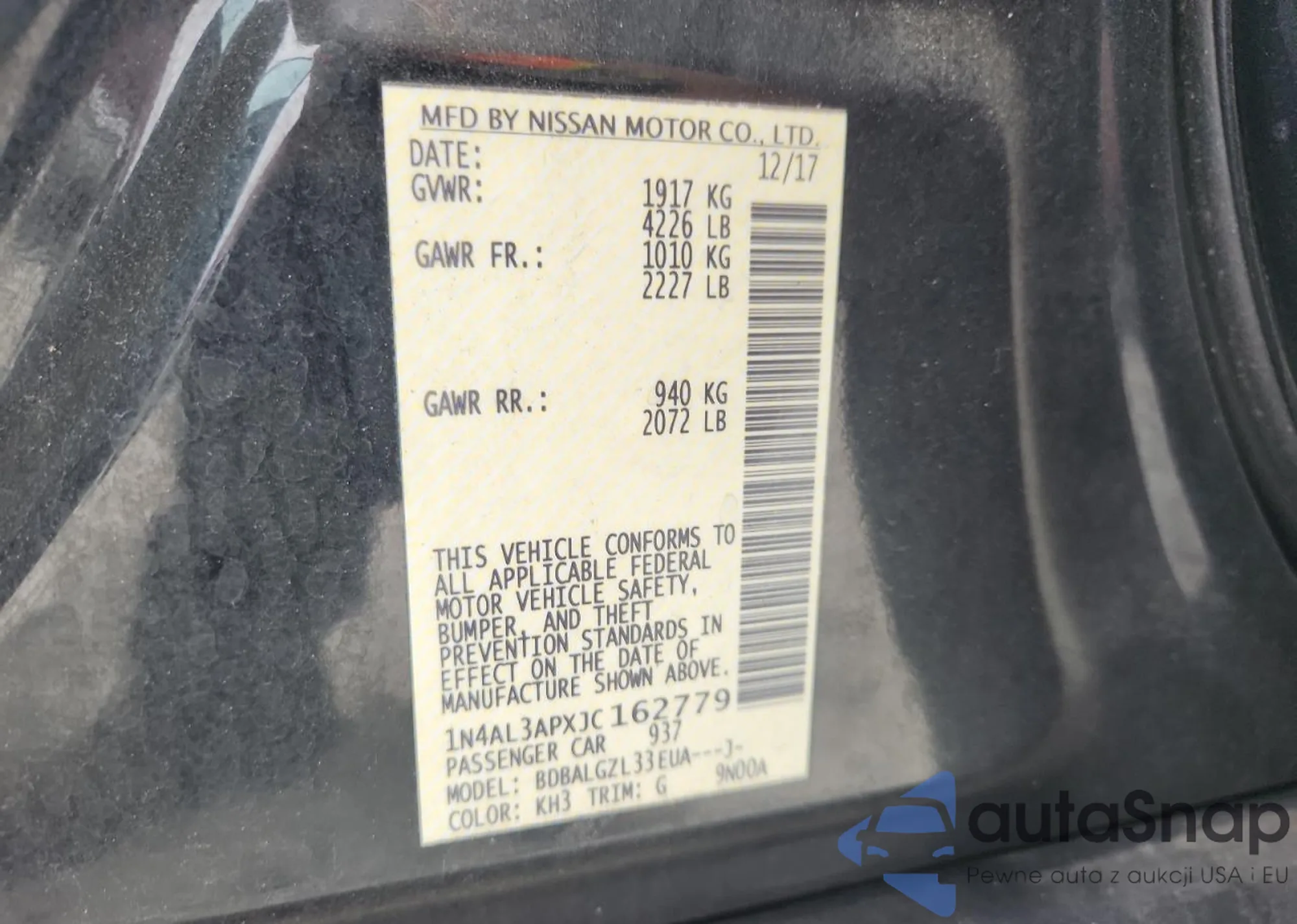 • VIN 1N4AL3APXJC162779