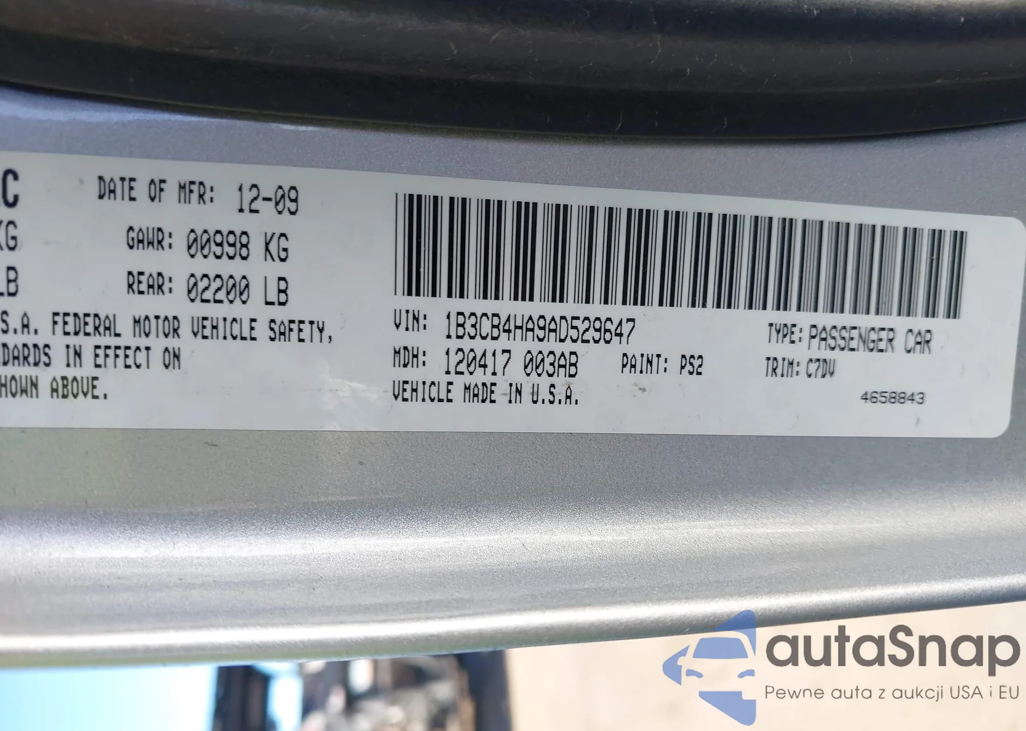 LOT: 43376826 VIN: 1B3CB4HA9AD529647