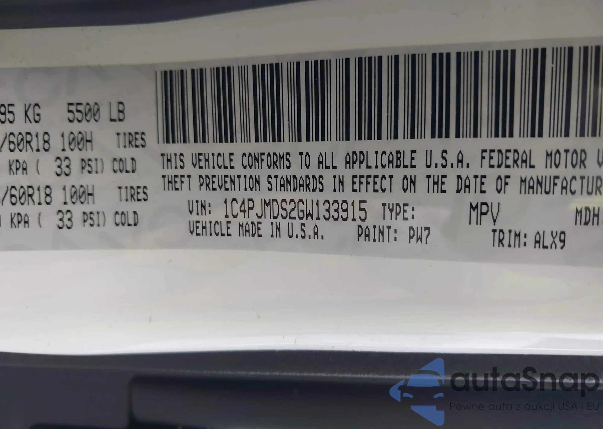 LOT: 42210883 VIN: 1C4PJMDS2GW133915