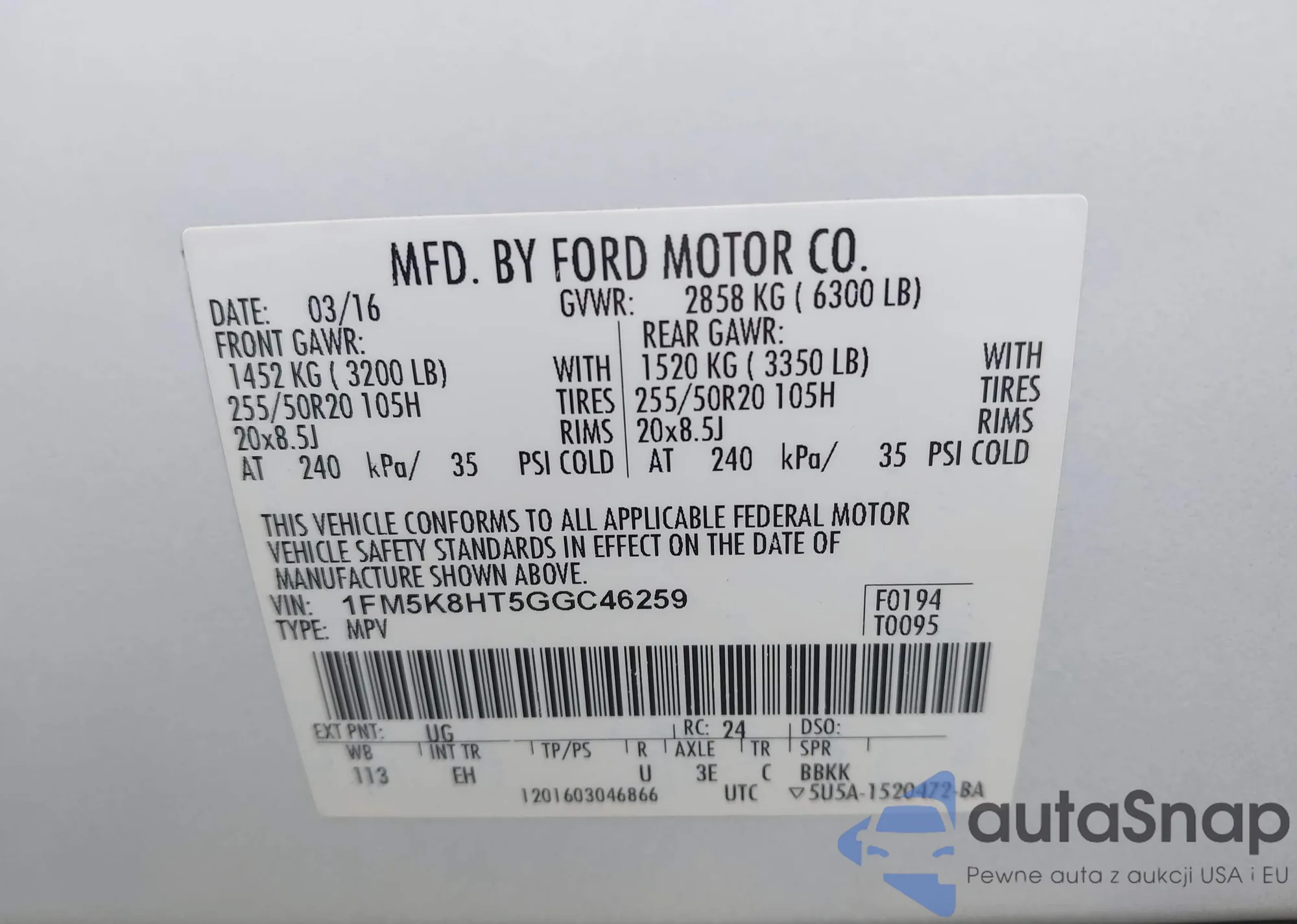 • VIN 1FM5K8HT5GGC46259