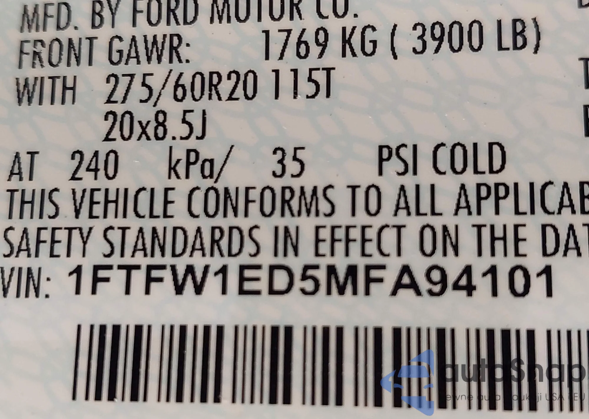 • VIN 1FTFW1ED5MFA94101