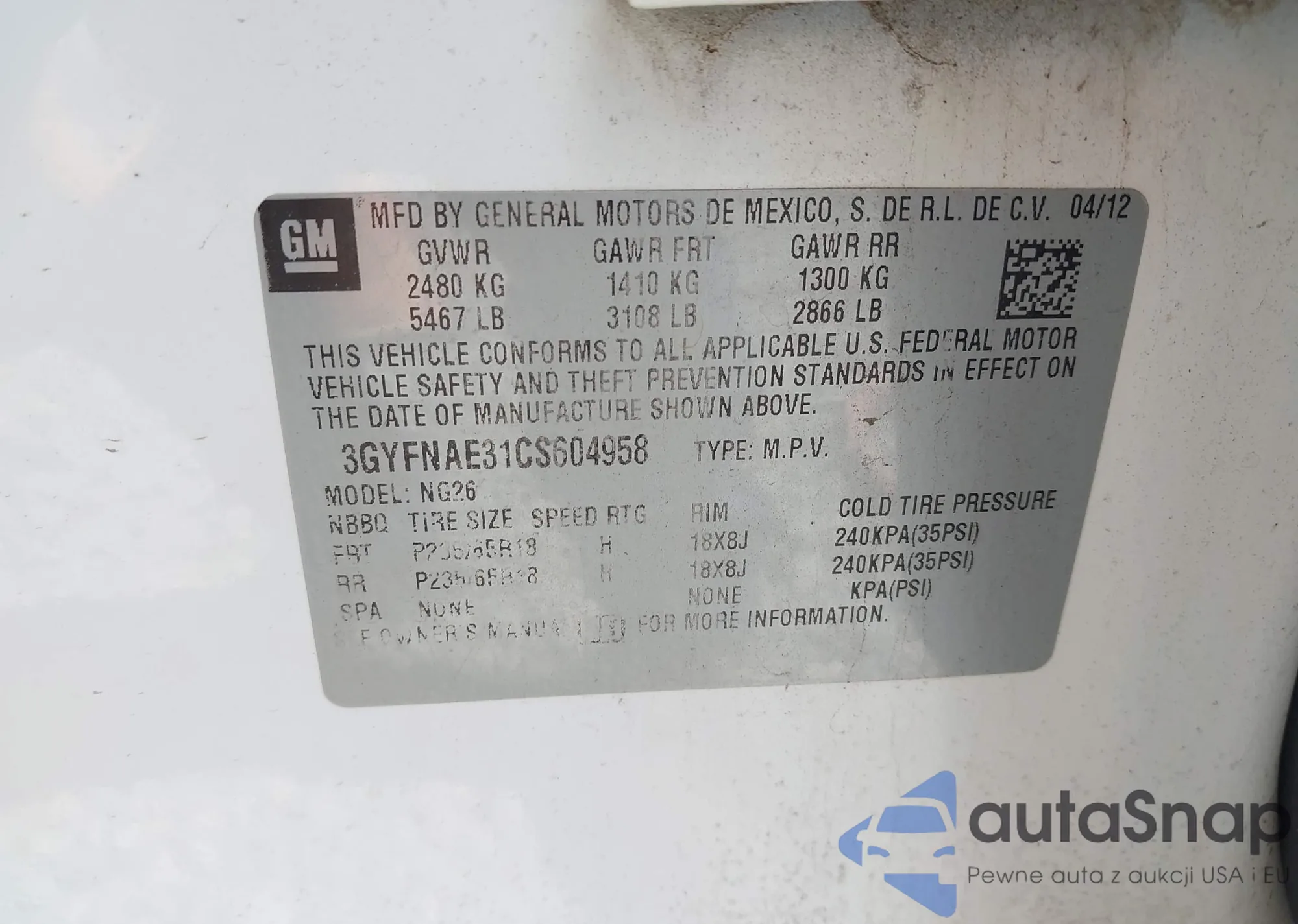 LOT: 43346980 VIN: 3GYFNAE31CS604958