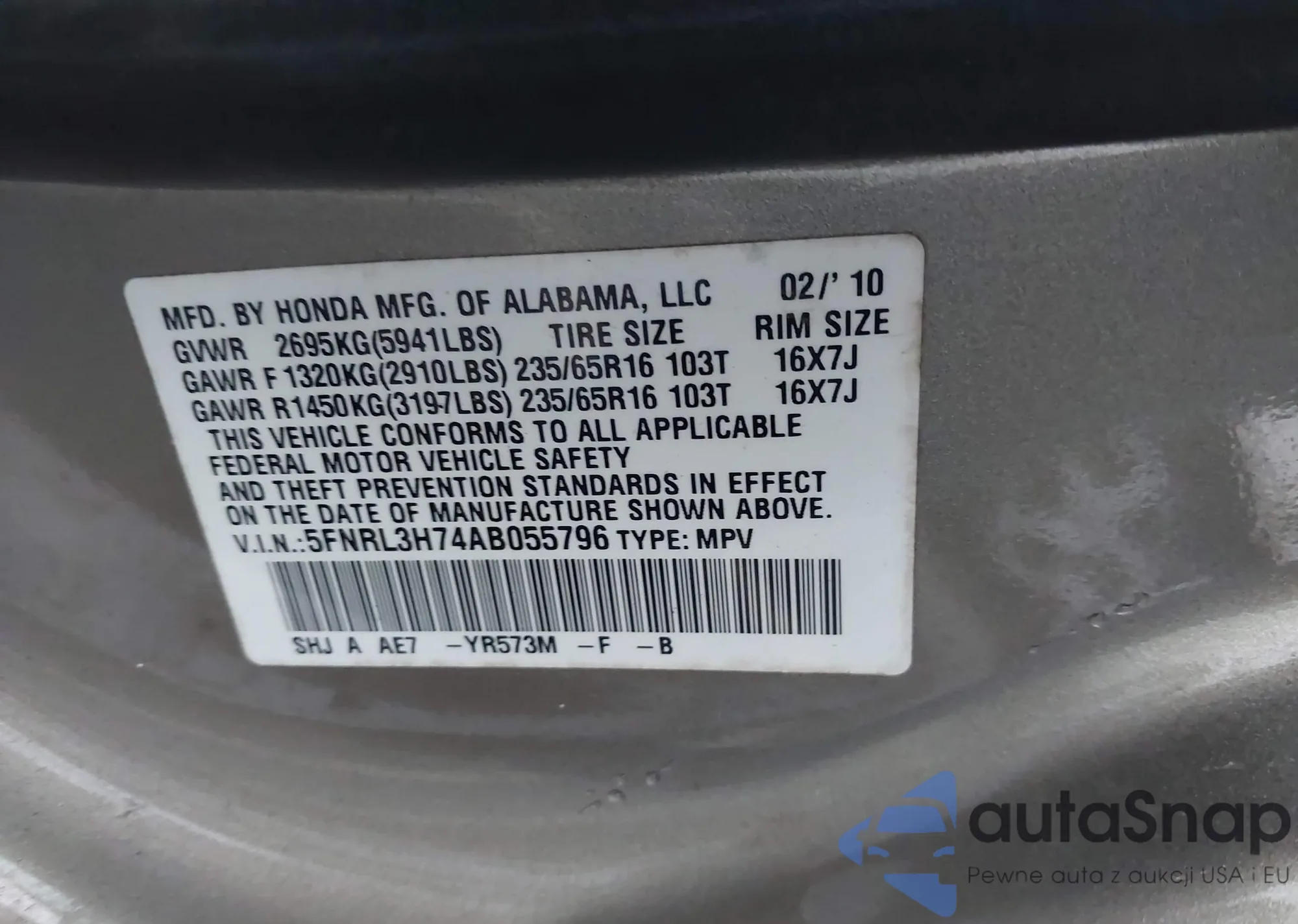 • VIN 5FNRL3H74AB055796