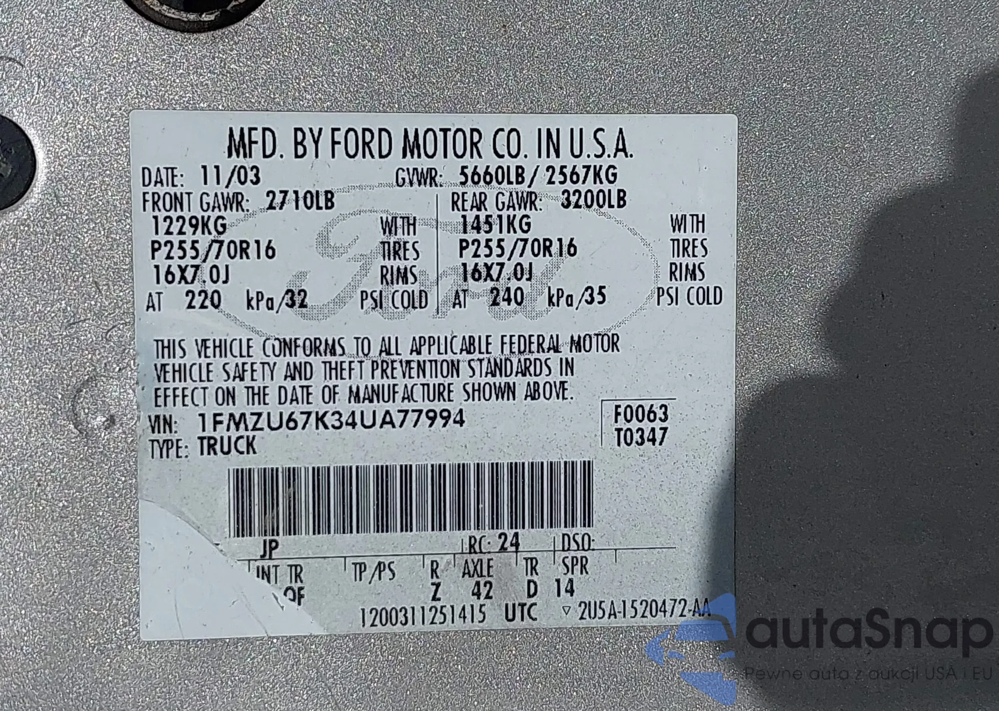 • VIN 1FMZU67K34UA77994