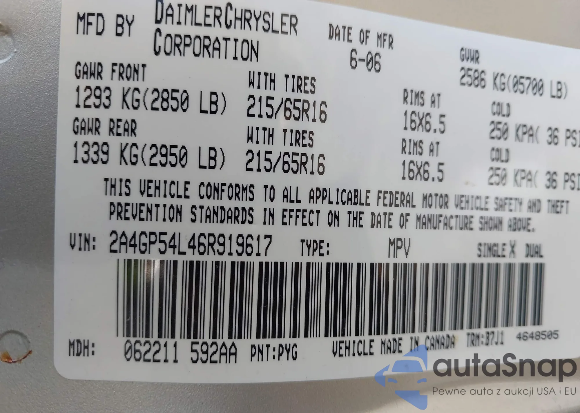 LOT: 43408085 VIN: 2A4GP54L46R919617
