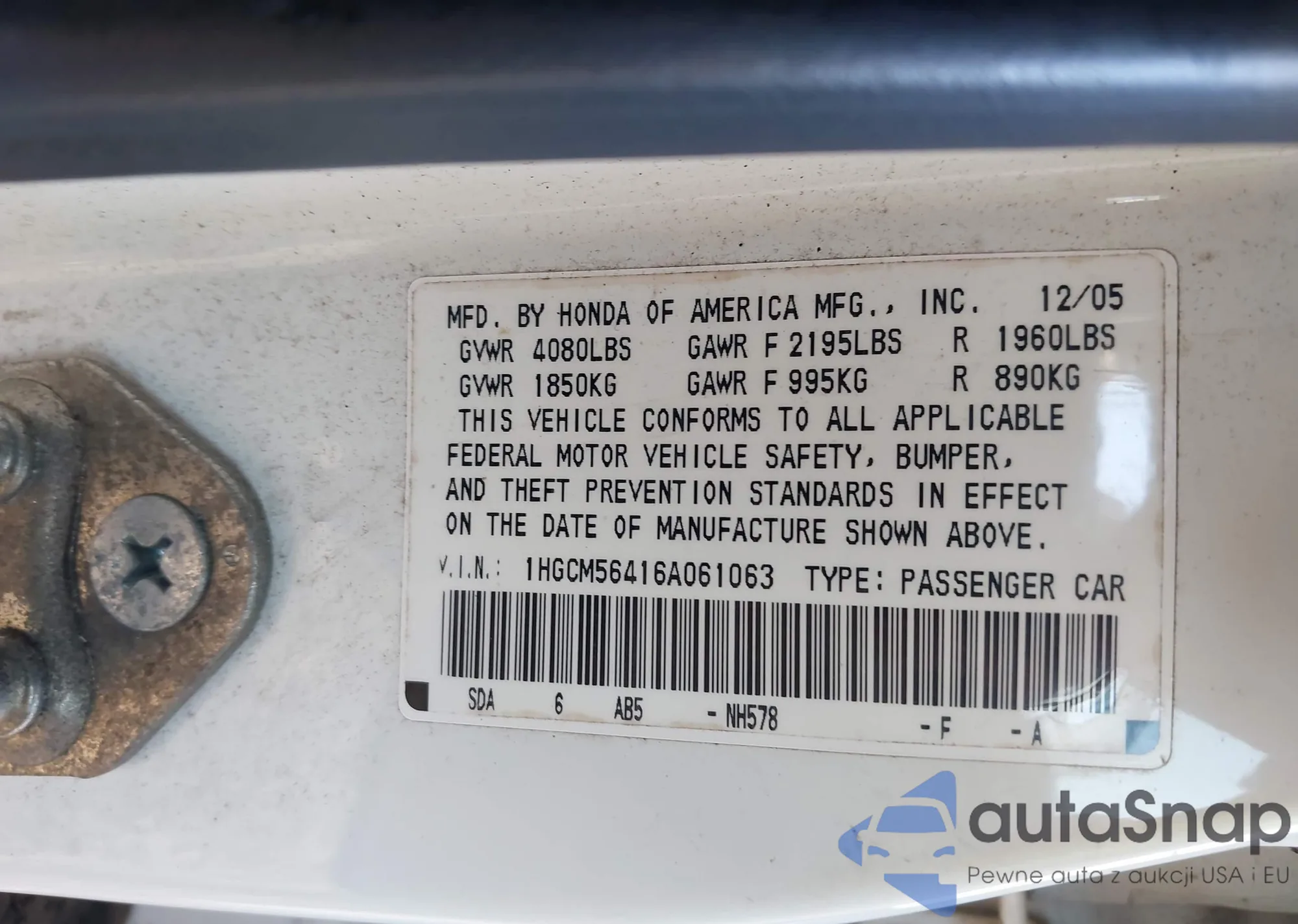 LOT: 43500100 VIN: 1HGCM56416A061063