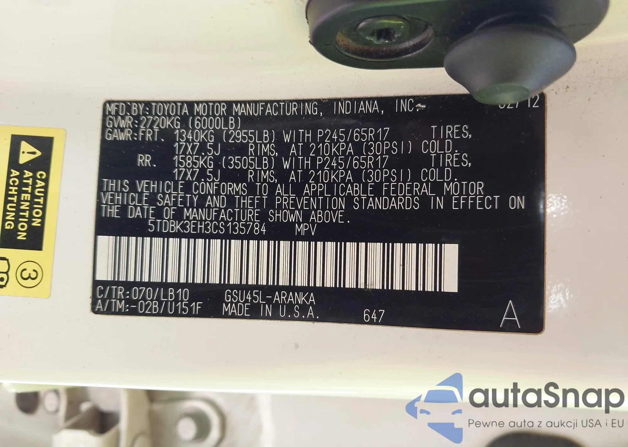 LOT: 42659300 VIN: 5TDBK3EH3CS135784