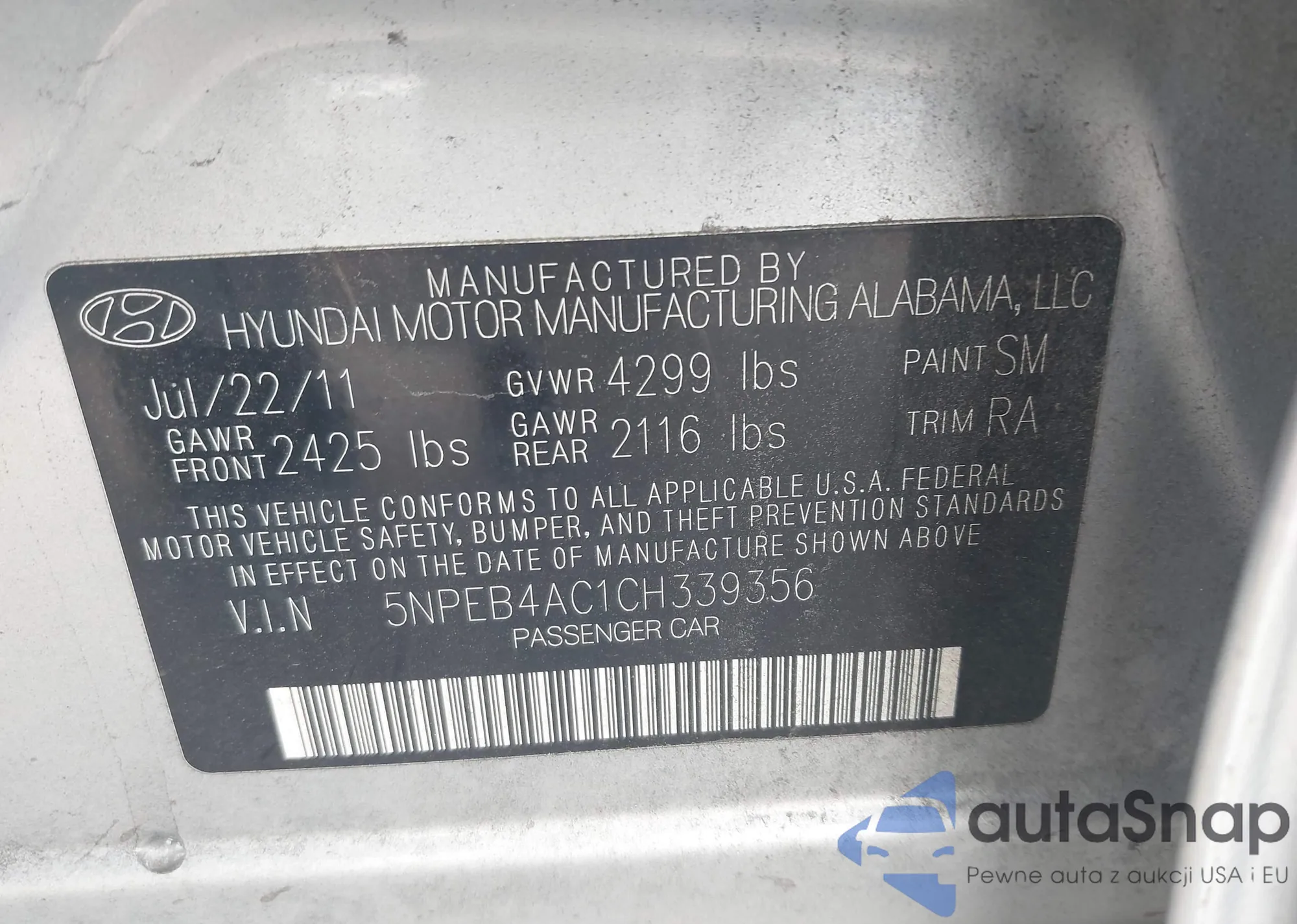 LOT: 43509523 VIN: 5NPEB4AC1CH339356
