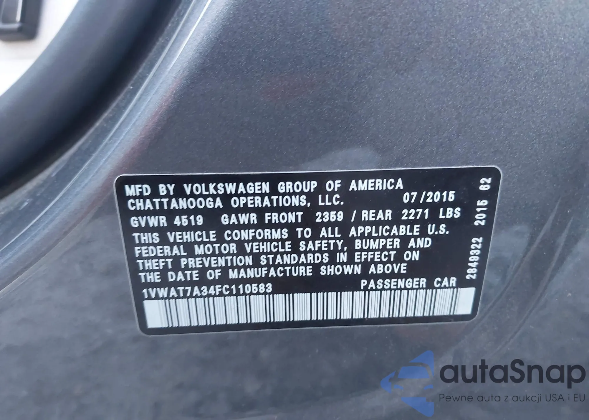 LOT: 43470925 VIN: 1VWAT7A34FC110583