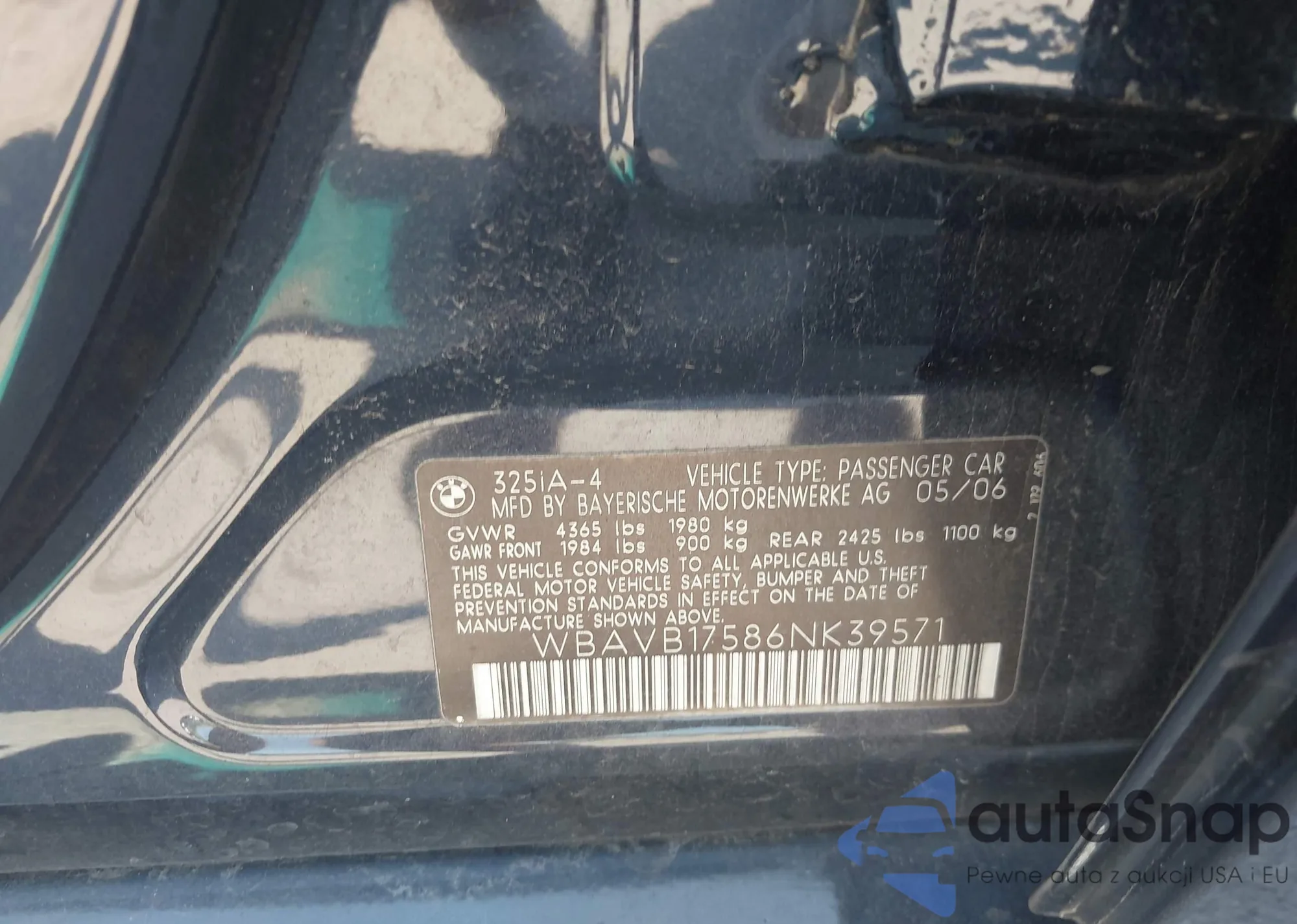 2006 BMW 325I z USA, uszkodzony, nr VIN WBAVB17586NK39571