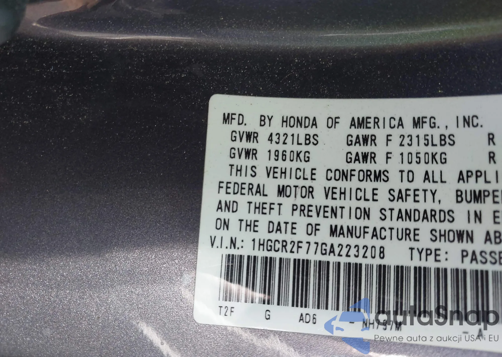 LOT: 43467622 VIN: 1HGCR2F77GA223208