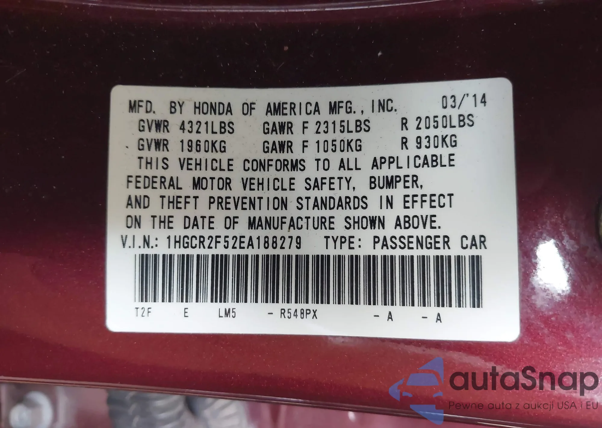 • VIN 1HGCR2F52EA188279