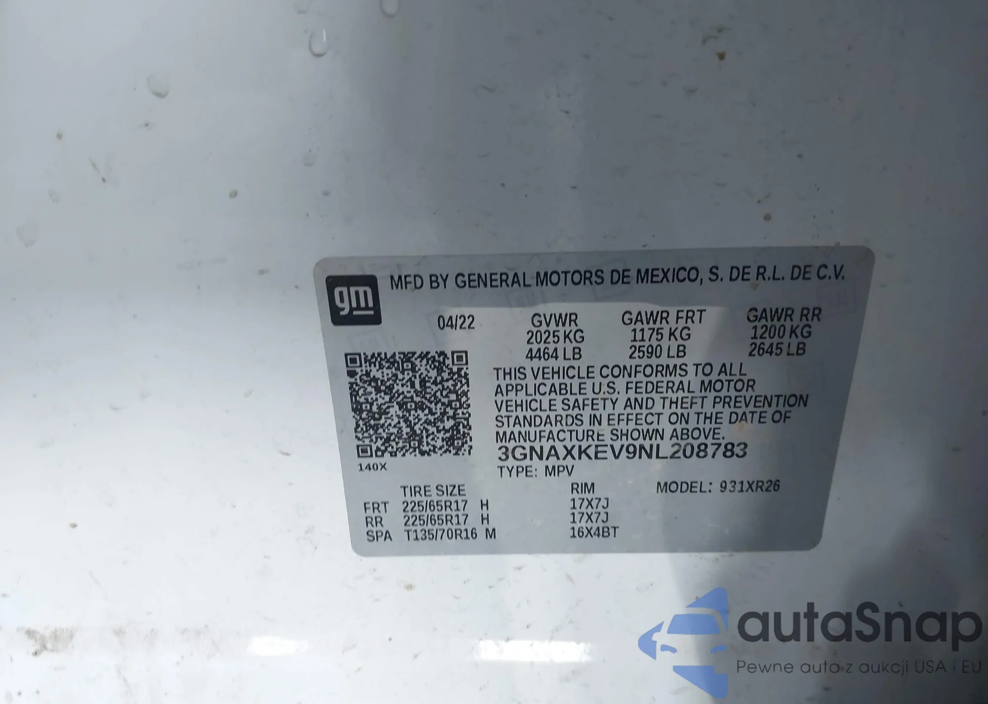 • VIN 3GNAXKEV9NL208783