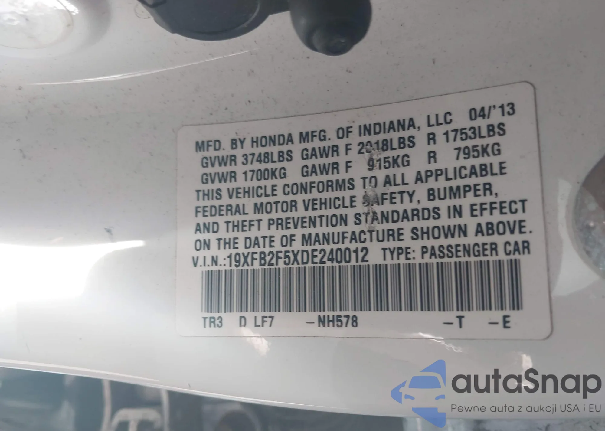 LOT: 43385279 VIN: 19XFB2F5XDE240012