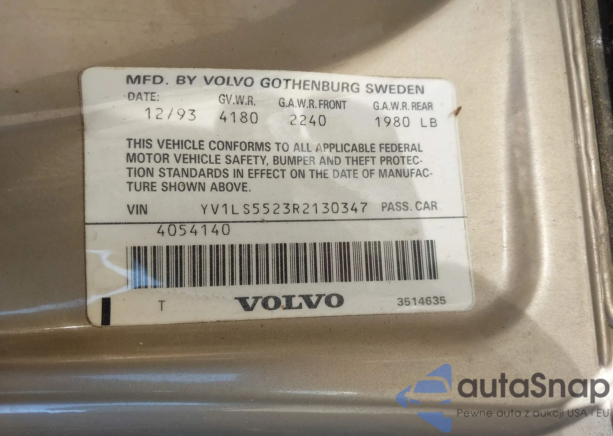 LOT: 43600501 VIN: YV1LS5523R2130347