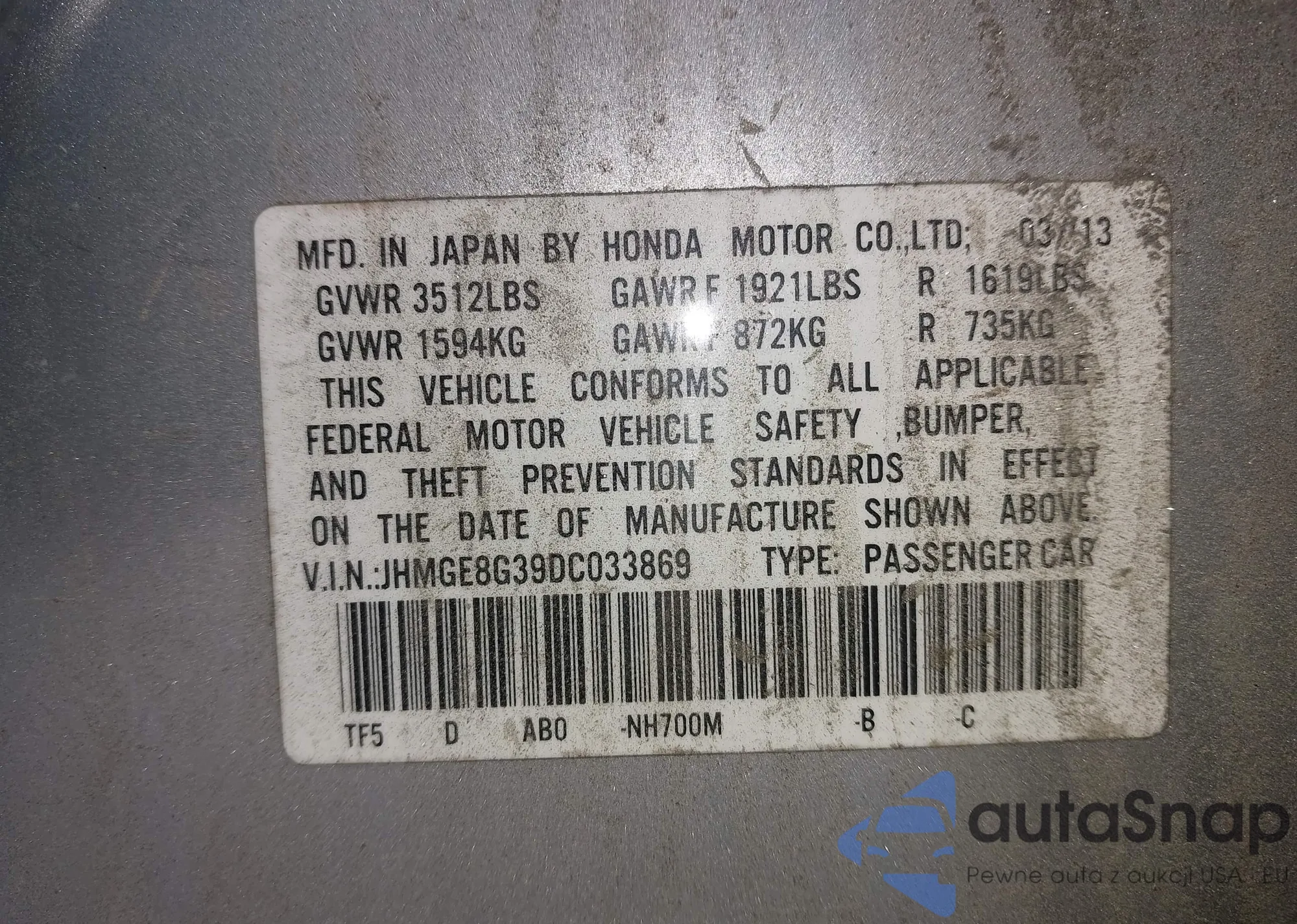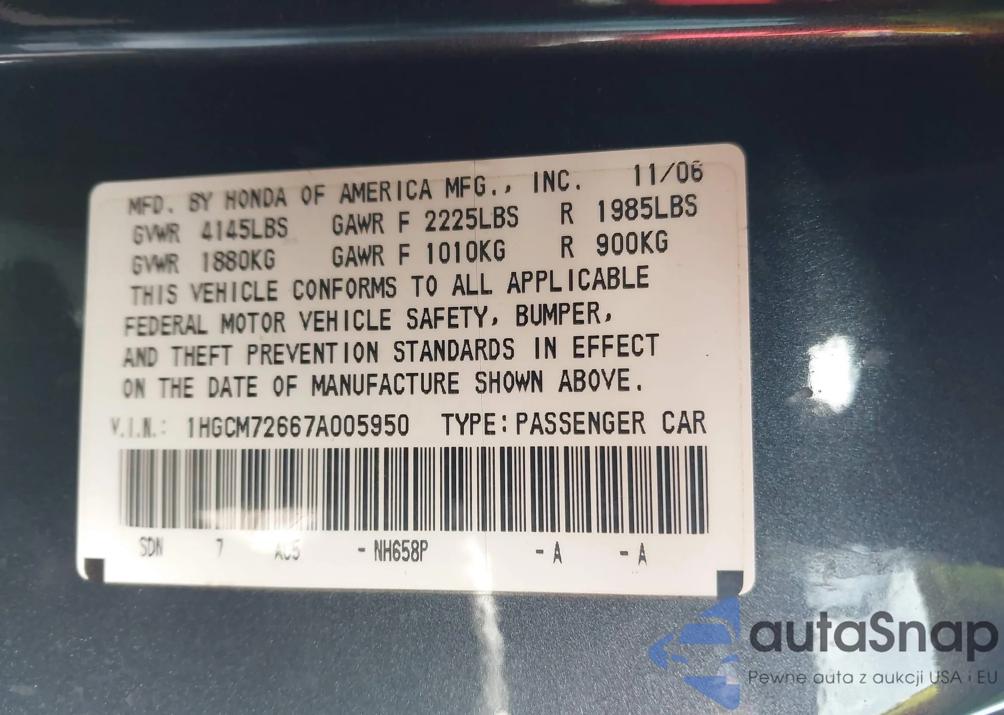 LOT: 43472249 VIN: 1HGCM72667A005950