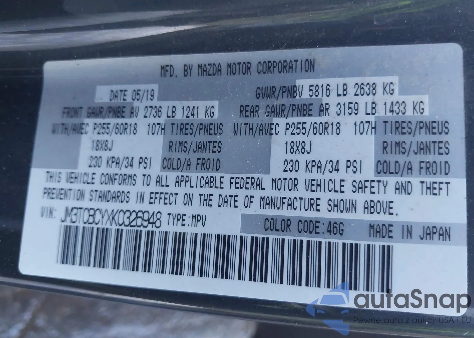 LOT: 43344134 VIN: JM3TCBCYXK0326948