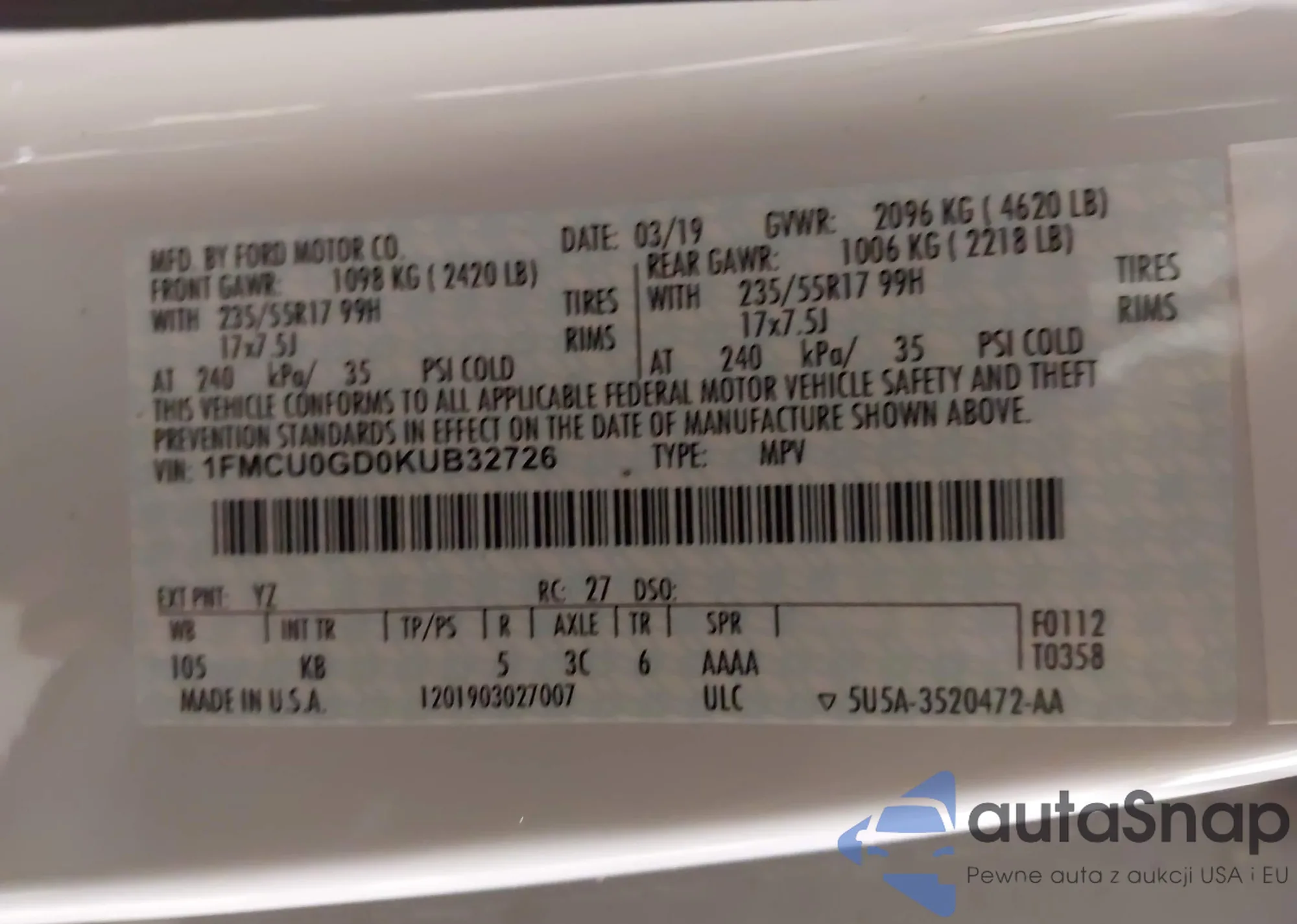 LOT: 43498990 VIN: 1FMCU0GD0KUB32726