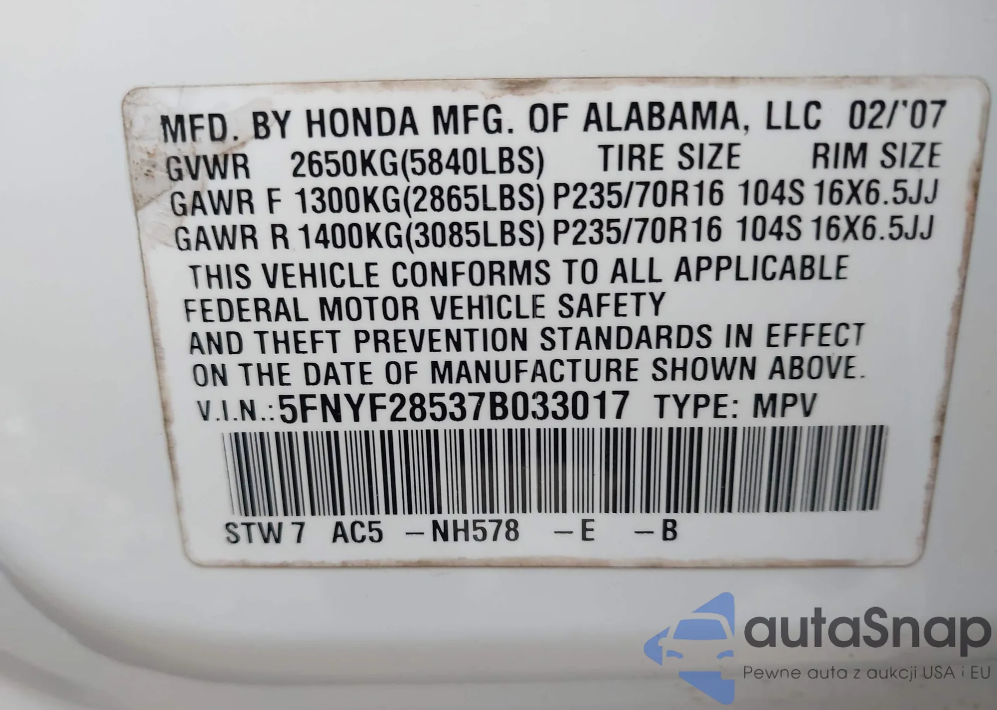 LOT: 42718676 VIN: 5FNYF28537B033017