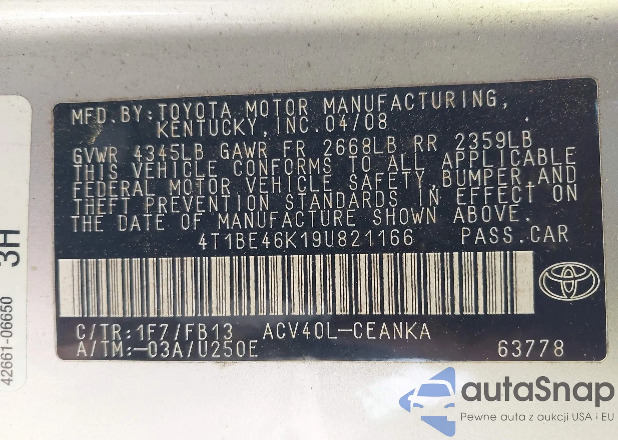 LOT: 43693763 VIN: 4T1BE46K19U821166