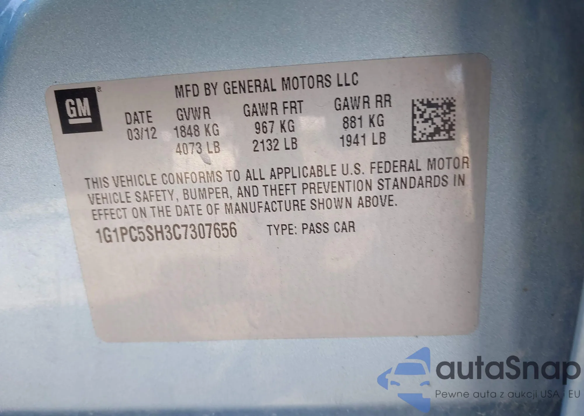 LOT: 43405251 VIN: 1G1PC5SH3C7307656