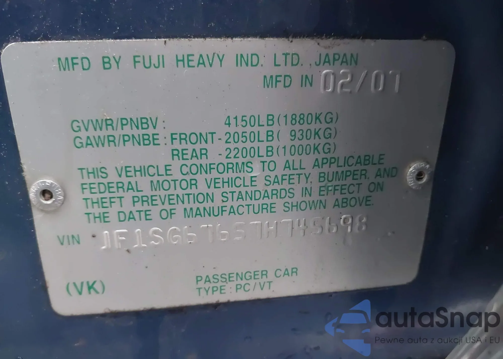LOT: 41957007 VIN: JF1SG67657H745698