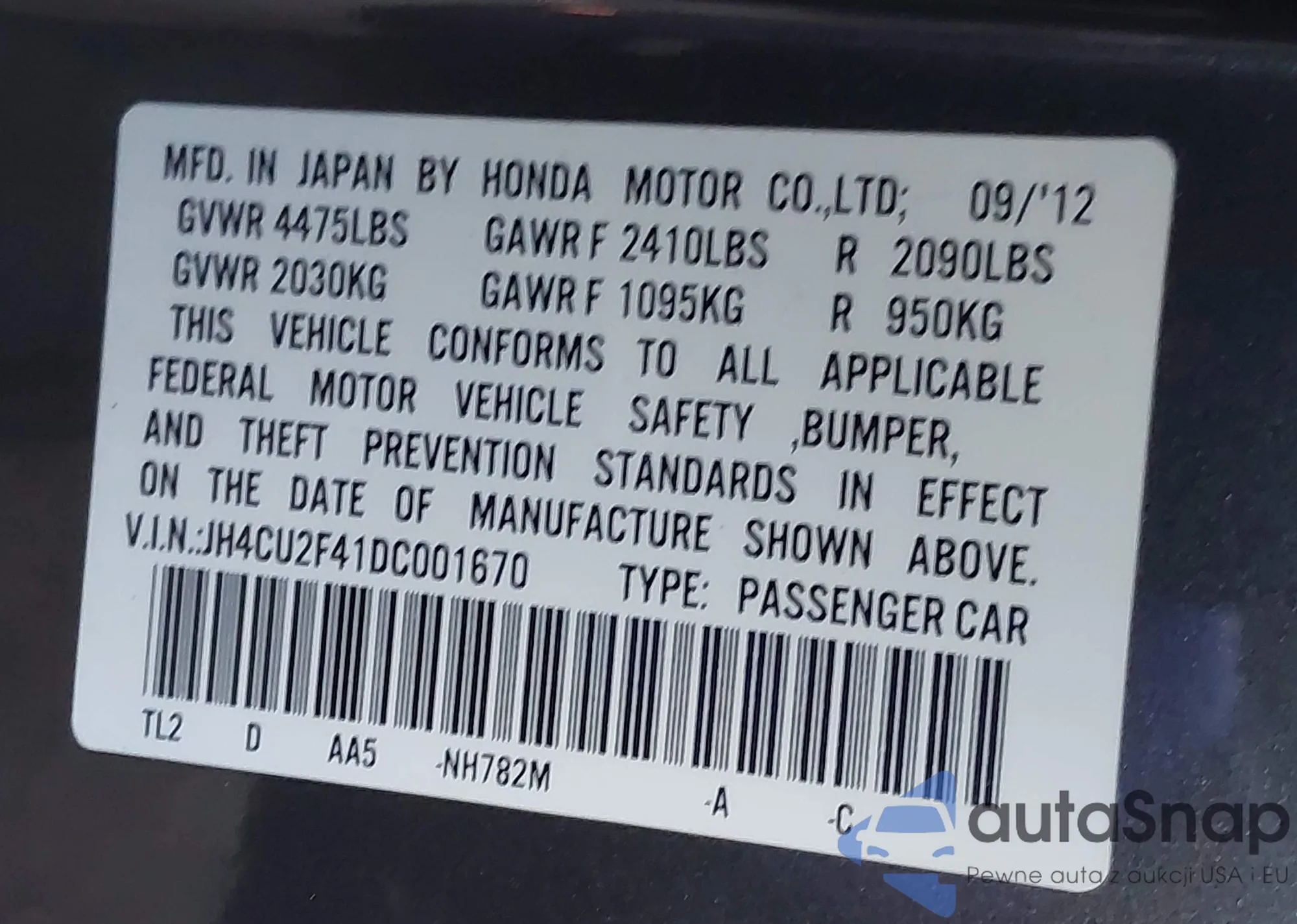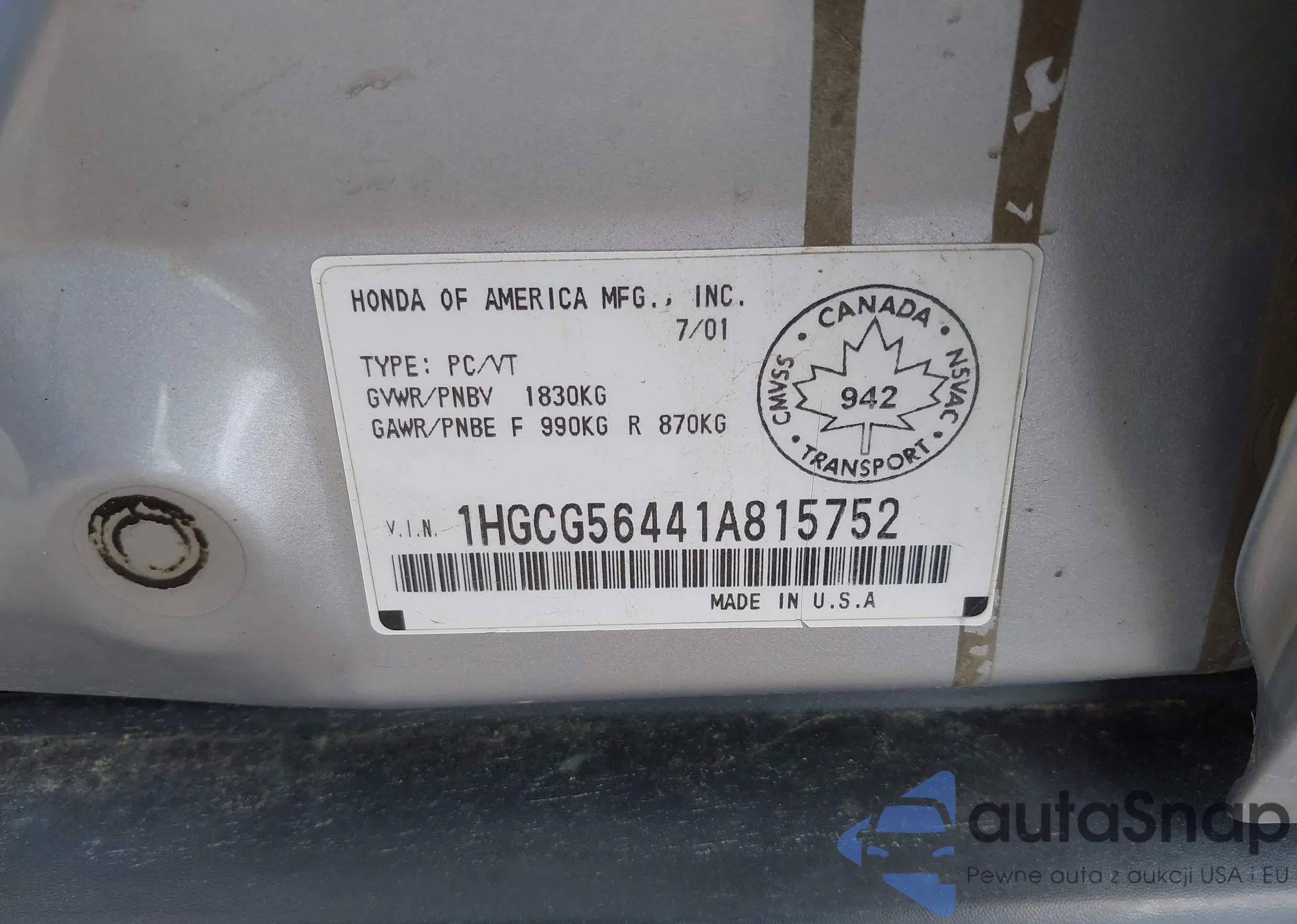 LOT: 43068445 VIN: 1HGCG56441A815752