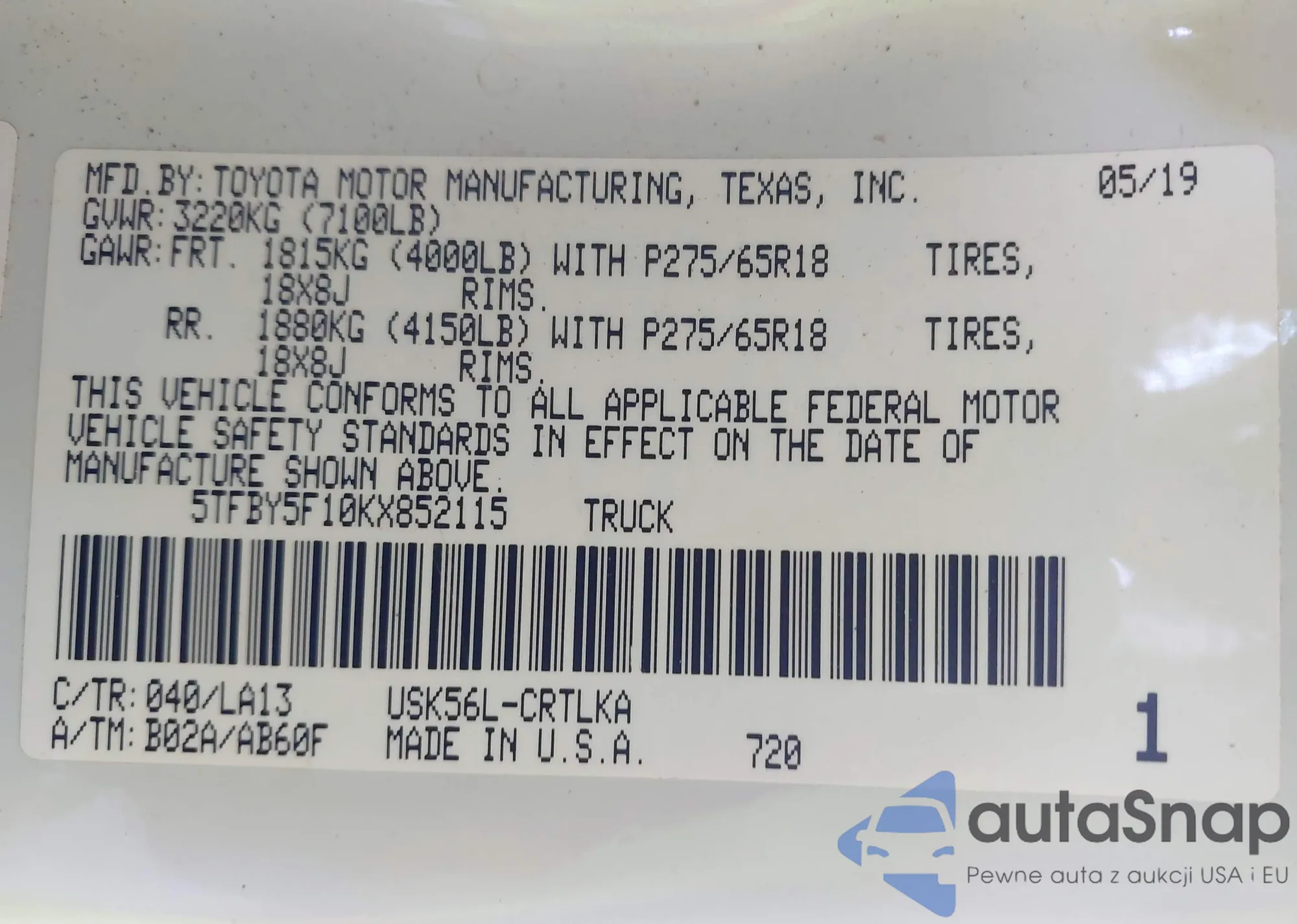• VIN 5TFBY5F10KX852115