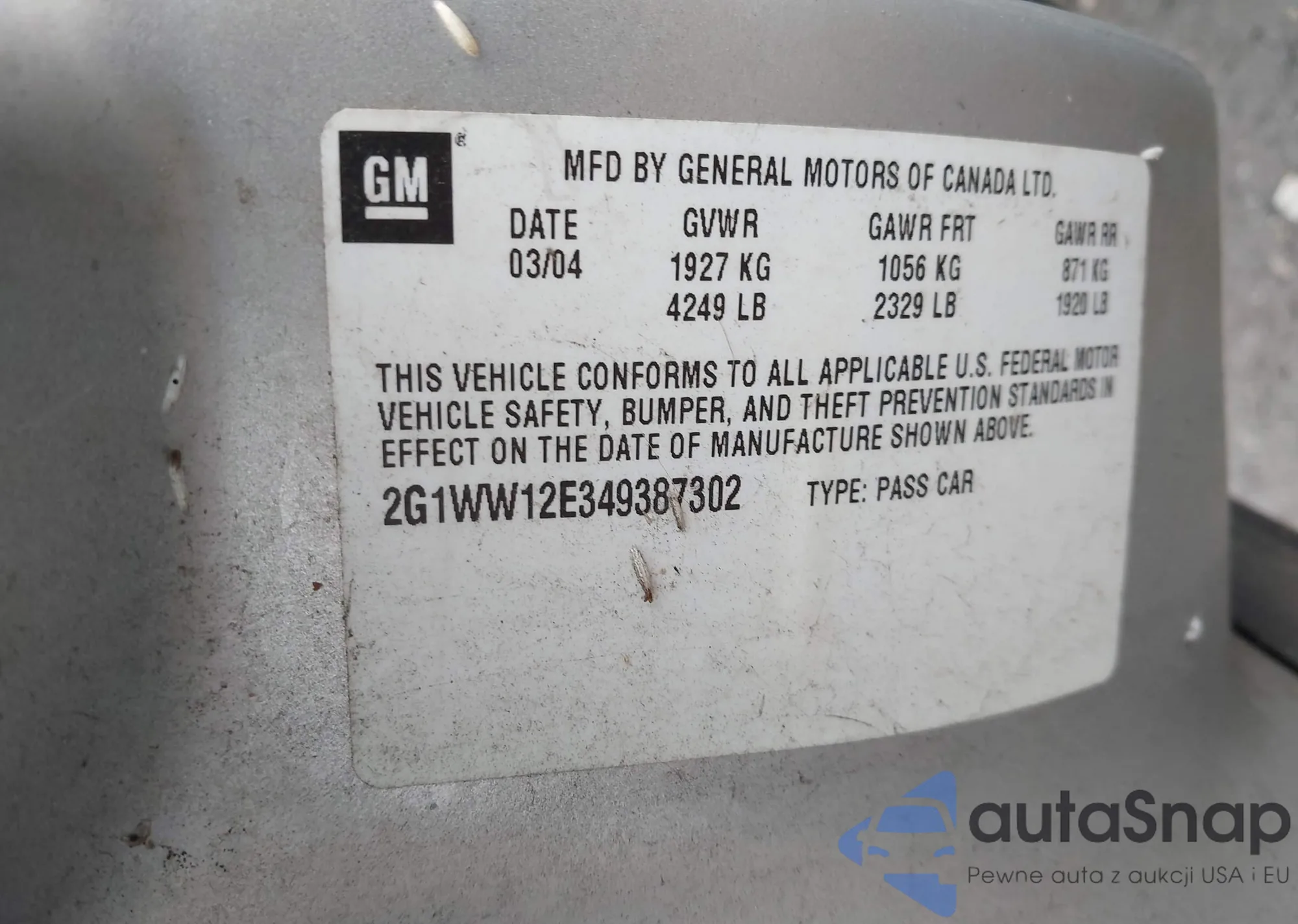 LOT: 42390199 VIN: 2G1WW12E349387302