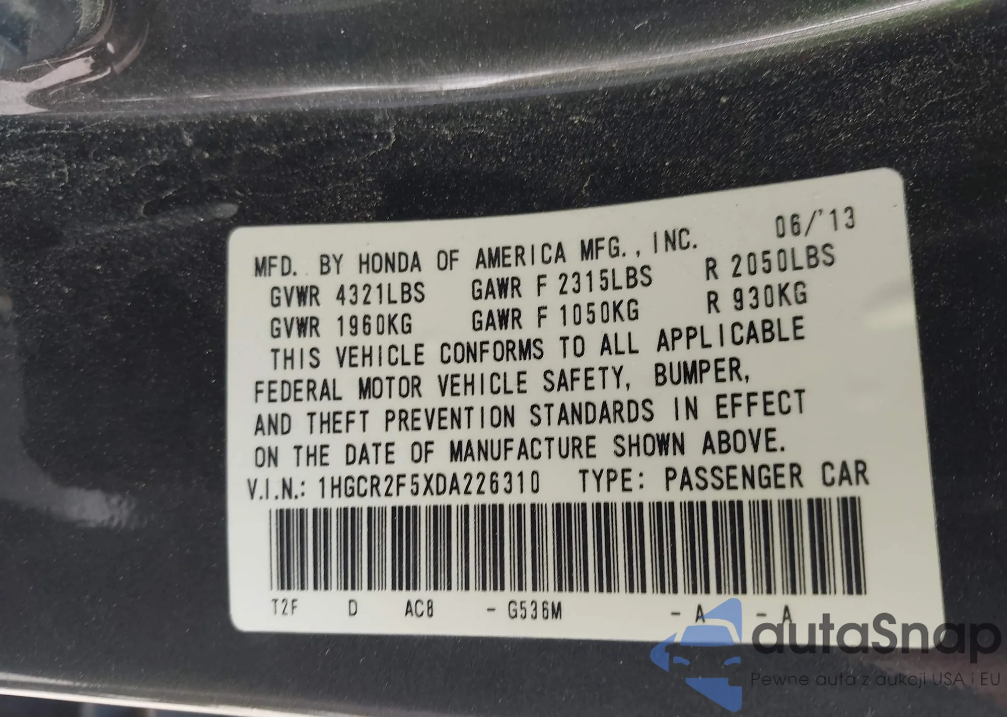 • VIN 1HGCR2F5XDA226310