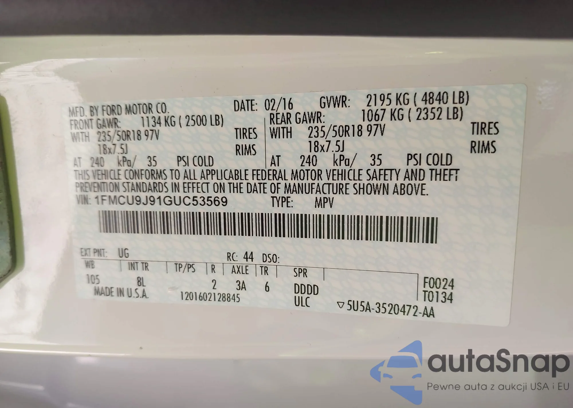 LOT: 43613569 VIN: 1FMCU9J91GUC53569