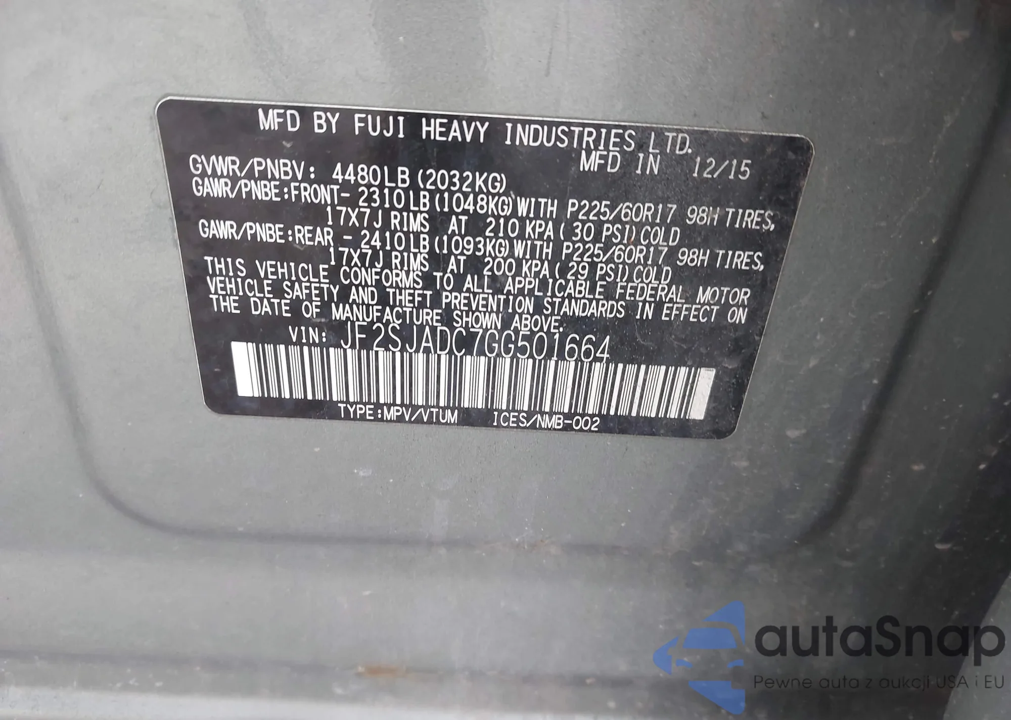 LOT: 43631896 VIN: JF2SJADC7GG501664
