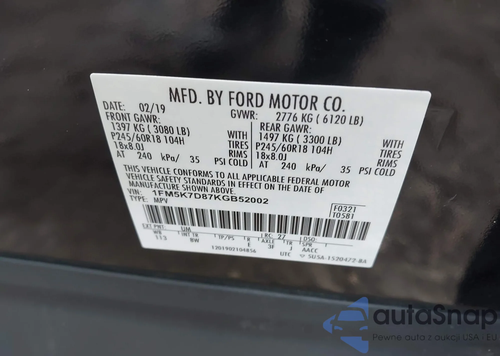 LOT: 43175972 VIN: 1FM5K7D87KGB52002