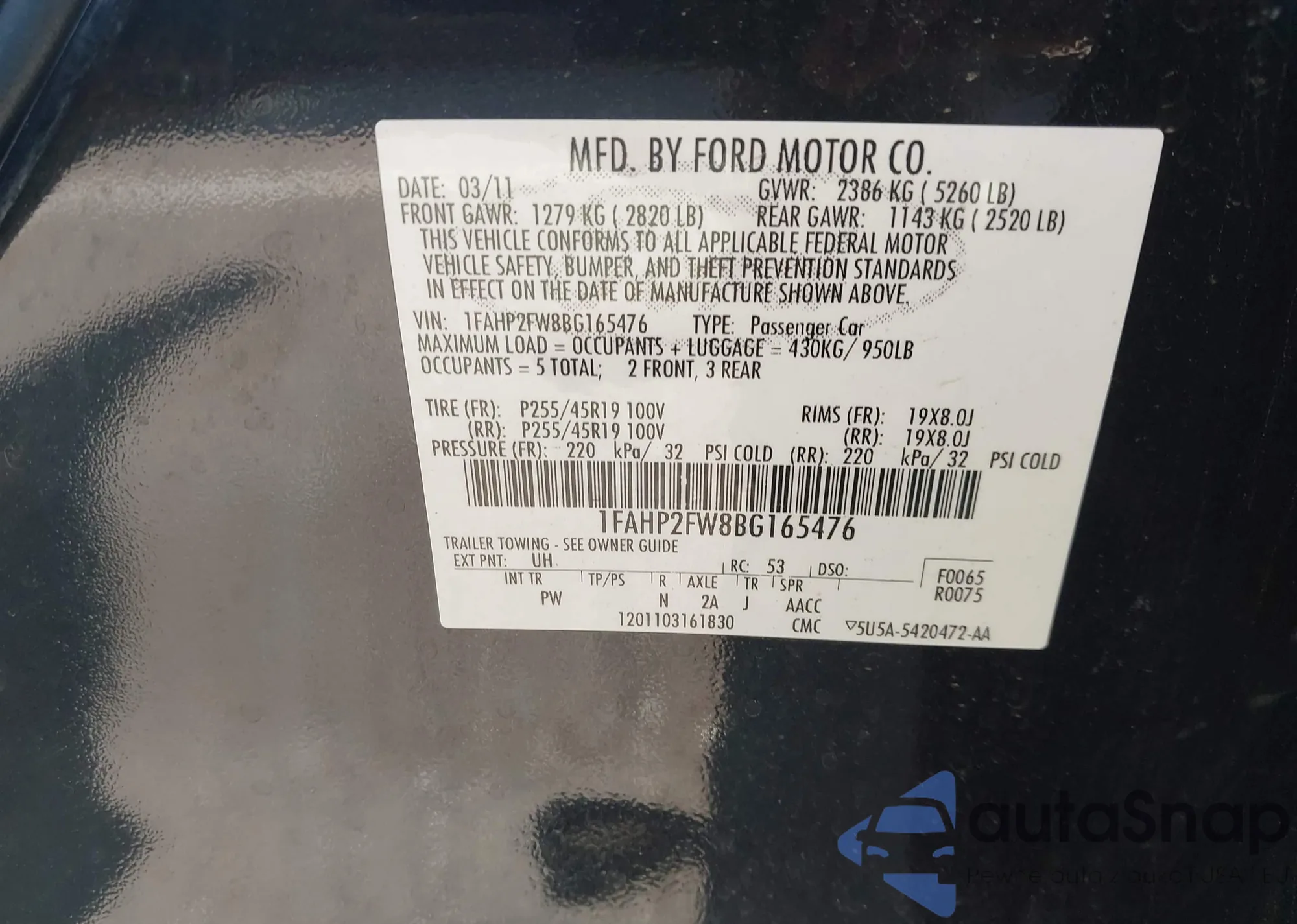 LOT: 43182728 VIN: 1FAHP2FW8BG165476