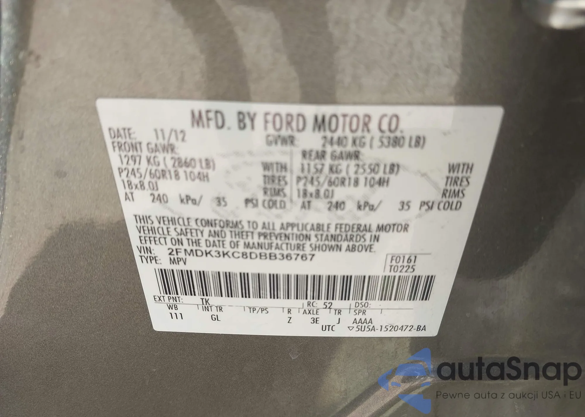 LOT: 43342730 VIN: 2FMDK3KC8DBB36767