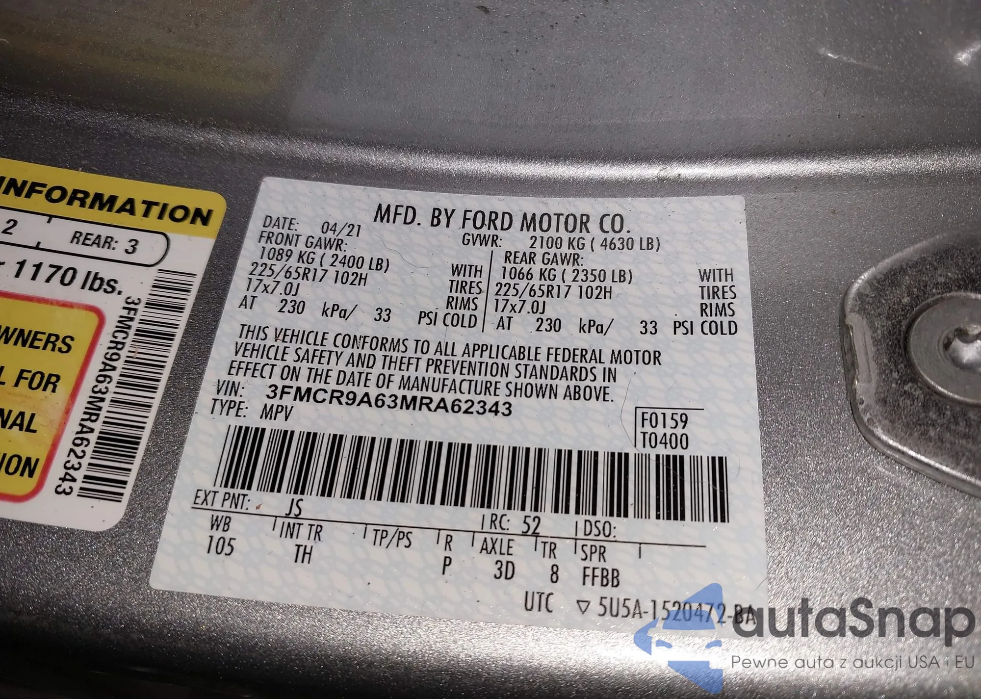 LOT: 43344581 VIN: 3FMCR9A63MRA62343