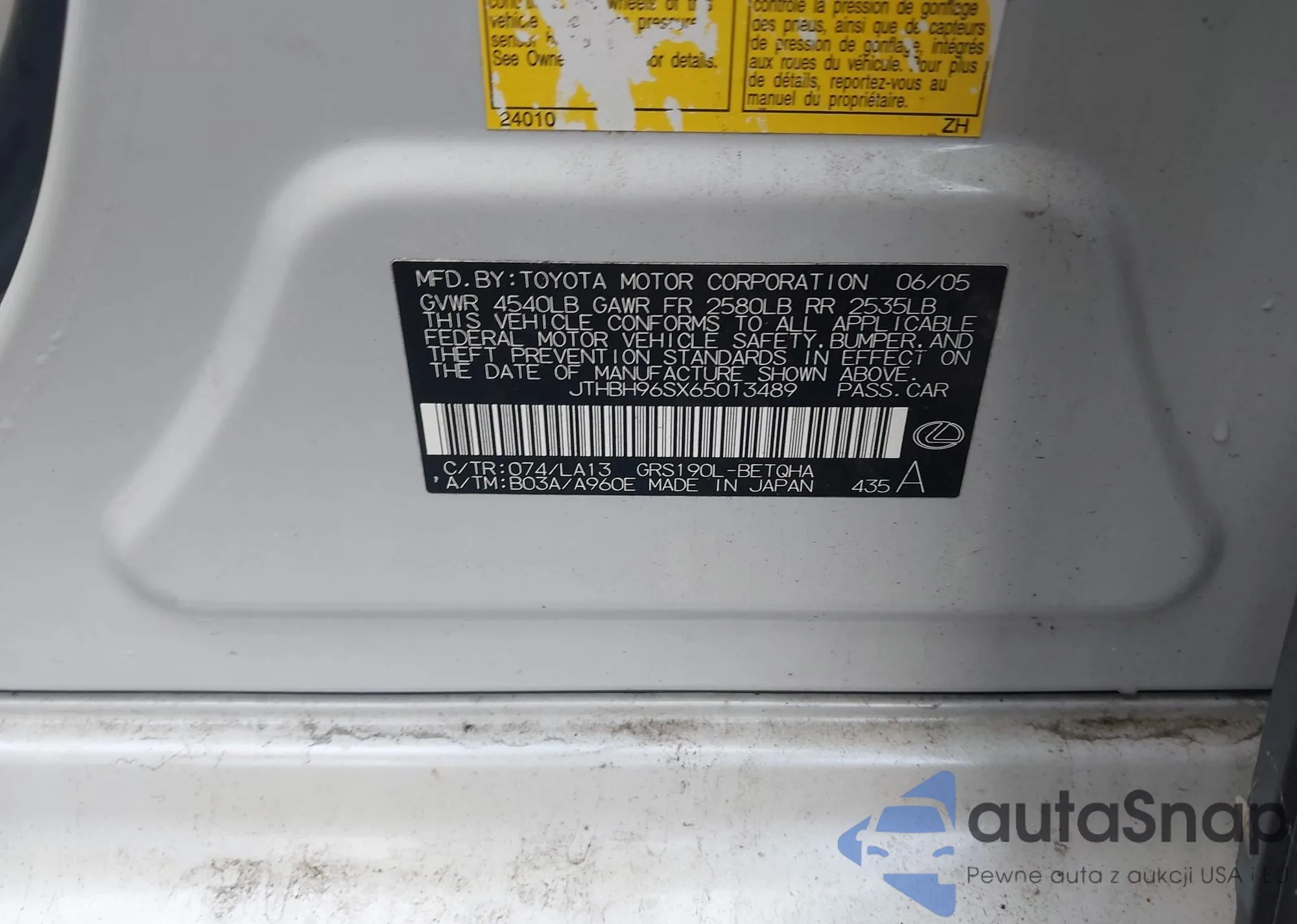LOT: 43309268 VIN: JTHBH96SX65013489