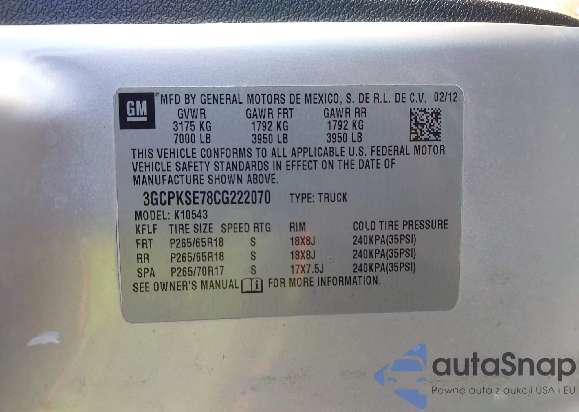 LOT: 43497953 VIN: 3GCPKSE78CG222070