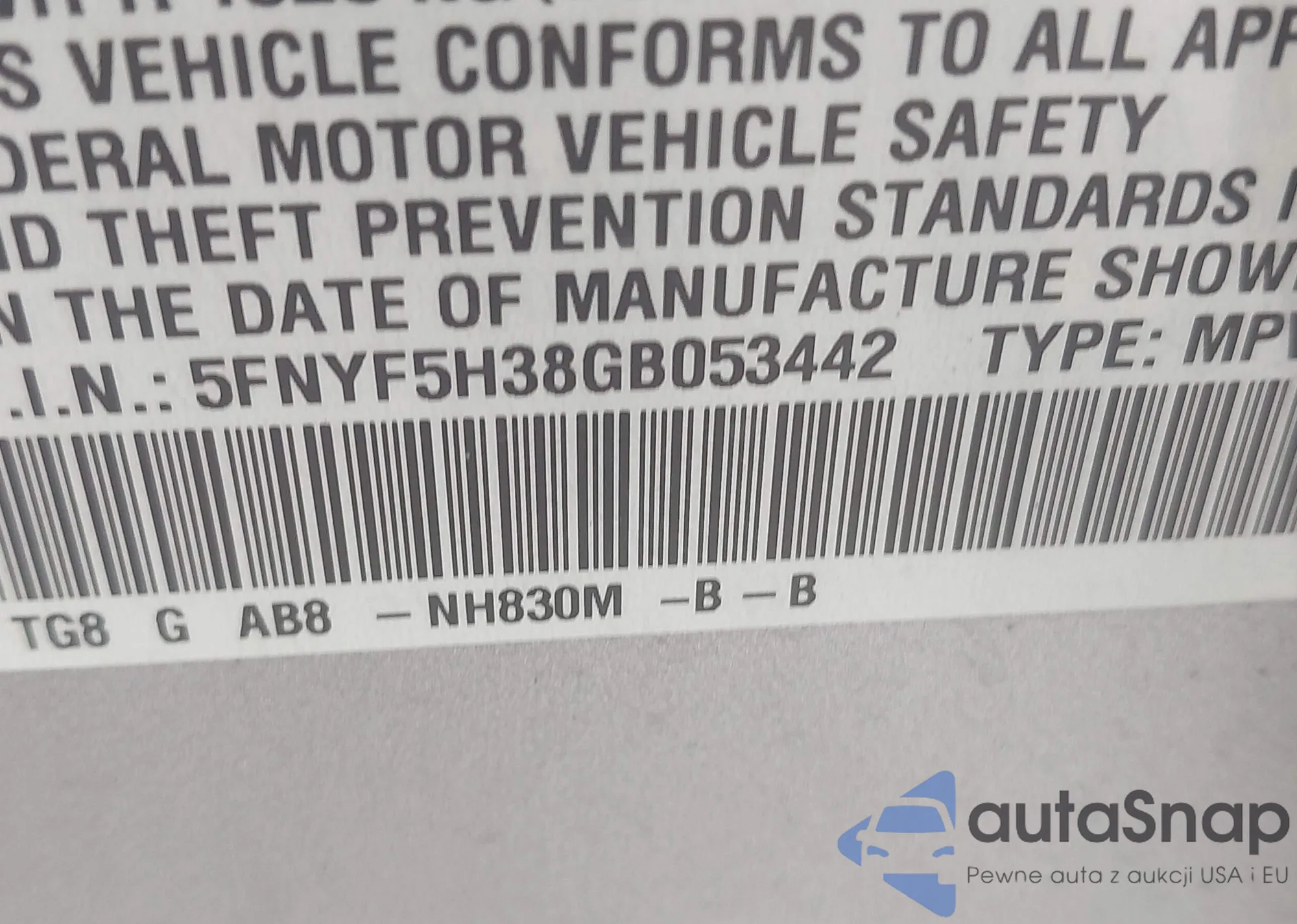 • VIN 5FNYF5H38GB053442