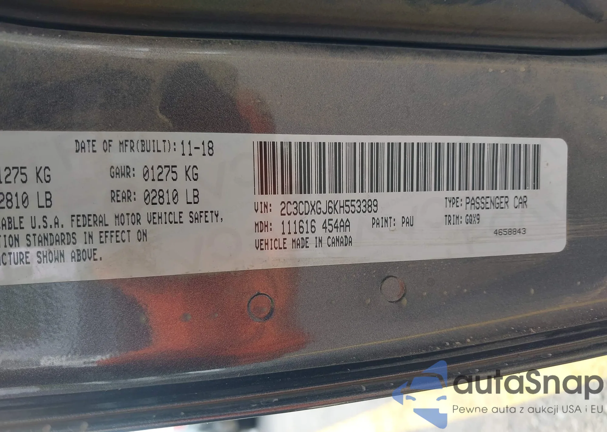 LOT: 43216927 VIN: 2C3CDXGJ6KH553389