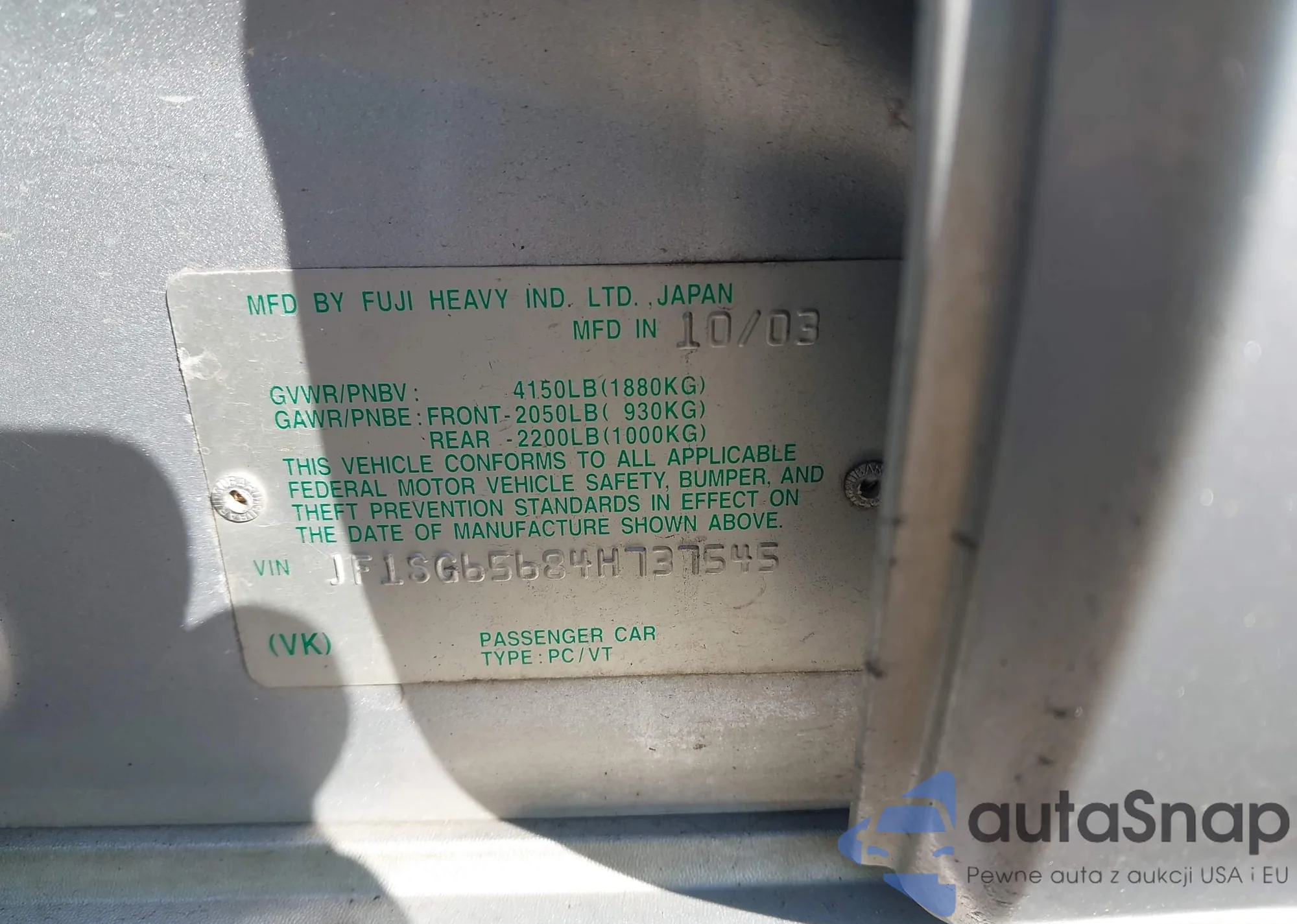 LOT: 43272636 VIN: JF1SG65684H737545
